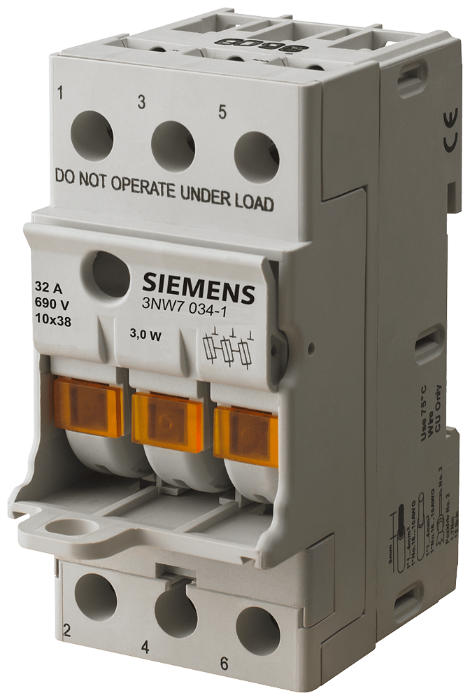 SENTRON, portafusibili per cartucce cilindriche, 10x38 mm, a 3 poli, In: 32 A, Un AC: 690 V, controllore d'intervento universale a LED, esecuzione compatta SENTRON, sistema di fusibili cilindrici per la protezione selettiva degli impianti. Le cartucce fusibili cilindriche e i relativi portafusibili sono adatti all'impiego in impianti industriali. Essi sono uno standard europeo e sono testati e omologati come sezionatori a fusibili ma non per la manovra sotto carico. Per la manovra sotto carico Siemens offre un'ampia gamma di prodotti ad es. i sezionatori 3KF. I sistemi di fusibili cilindrici si contraddistinguono soprattutto per le seguenti caratteristiche: 1. Conformità alle norme IEC 60269-1, -2 e -3. 2. Conformità alla norma UL 512. 3. Rapida sostituzione del fusibile grazie al posto per fusibili di ricambio nel portafusibili. 4. Rapido riconoscimento del fusibile bruciato mediante LED lampeggiante in caso di intervento.