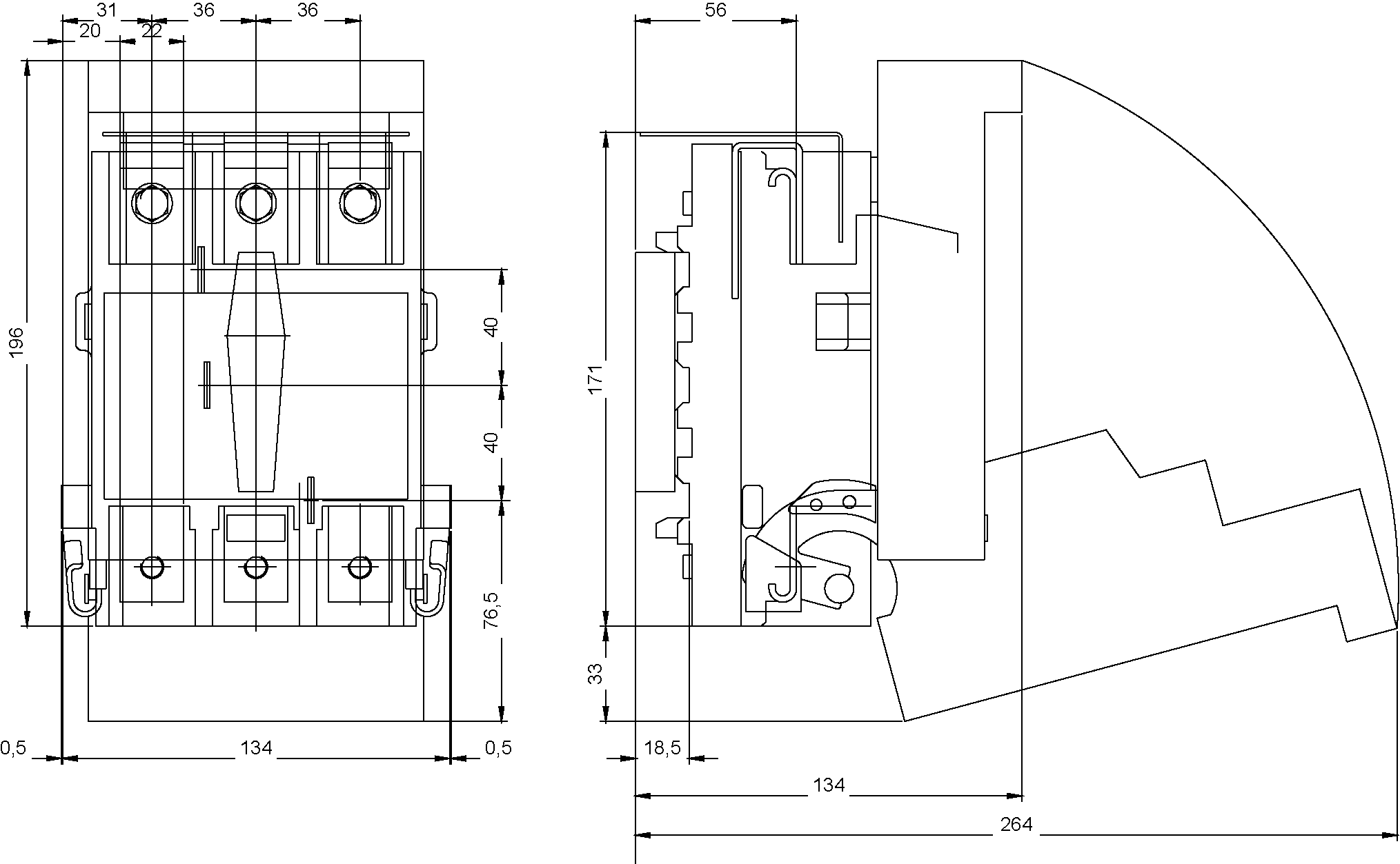 SENTRON, sezionatore sottocarico a fusibili 3NP5, a 3 poli, NH00, 160 A, con Adattatore per Sistema di sbarre collettrici 8US 40mm, con inserzione rapida, morsetto a staffa Sezionatori sottocarico a fusibili 3NP fino a 630 A con protezione delle persone e degli impianti migliorata e comoda tecnica di collegamento. I sezionatori sottocarico a fusibili proteggono gli impianti nell'industria o nell'infrastruttura da sovraccarico e cortocircuito e sono adatti all'impiego in tutti i settori. La protezione avvolgente e contro i contatti accidentali presente come standard nella nuova serie Sentron 3NP1 impedisce che l'utente possa toccare parti conduttrici di corrente durante il montaggio dei sistemi di sbarre collettrici, persino in caso di accesso dal lato posteriore. Inoltre, l'utente può riconoscere facilmente attraverso la grande finestra di ispezione i fusibili impiegati. I sezionatori sottocarico a fusibili 3NP di Siemens si contraddistinguono soprattutto per le seguenti caratteristiche: 1. Massima flessibilità grazie alla costruzione modulare e agli accessori omogenei. 2. Idoneità al fissaggio su base, guida DIN e sistema di sbarre collettrici Siemens 8US 3. Funzione elettronica di controllo fusibili incl. controllo di rete. 4. Cinque grandezze costruttive da 100 A a 630 A e fino al grado di protezione IP40. 5. Modifica rapida e sicura per l'uscita cavi in alto / in basso. 6. Possibilità di stabilire in modo flessibile i punti di commutazione del blocchetto di contatti ausiliari (in contemporanea o in anticipo). 7. Possibilità di chiusura a lucchetto e piombatura.