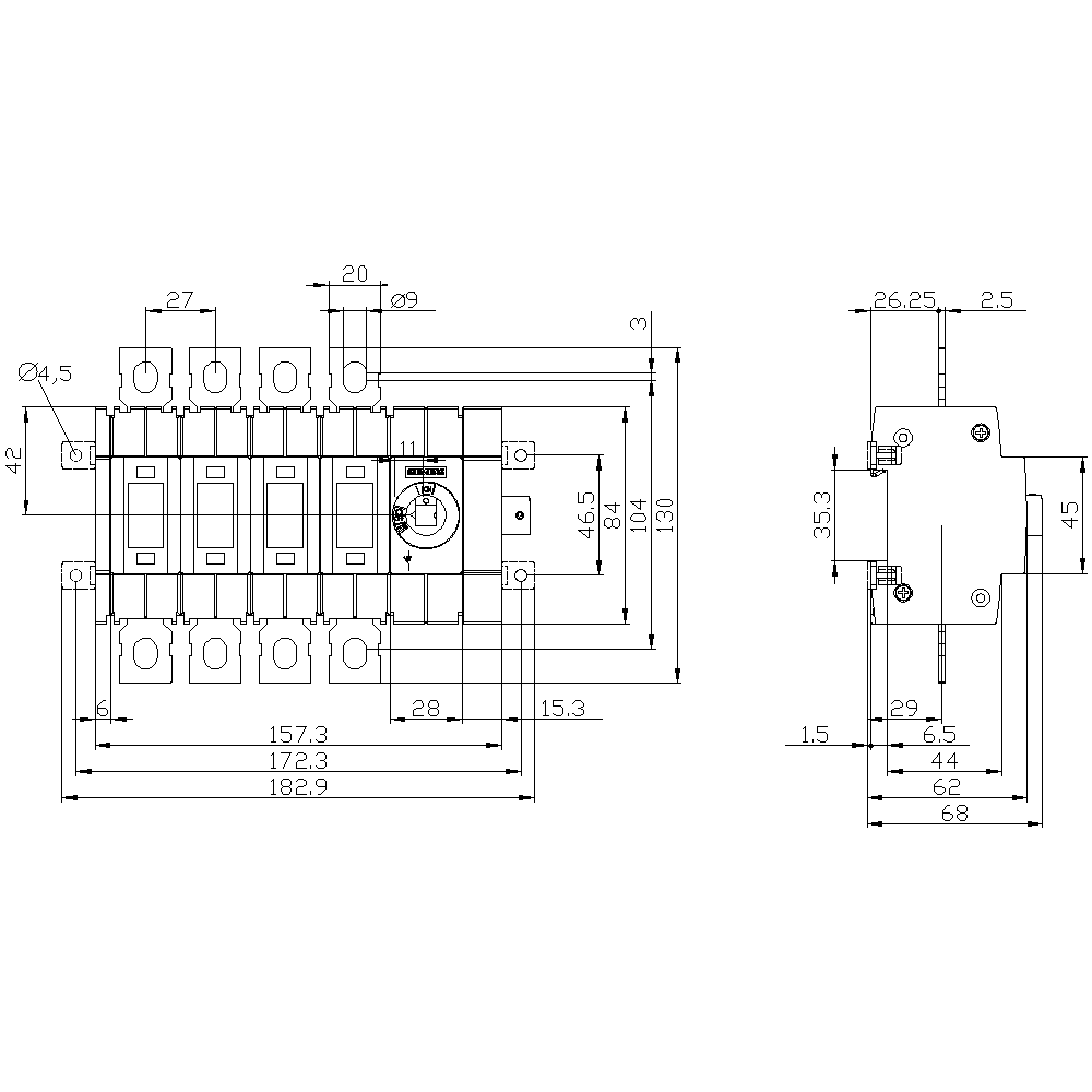 SIEMENS - Sezionatore sottocarico 100 A, grand. costr. 2, a 4 poli, comando laterale a destra, apparecchio di base 3KD30440NE400