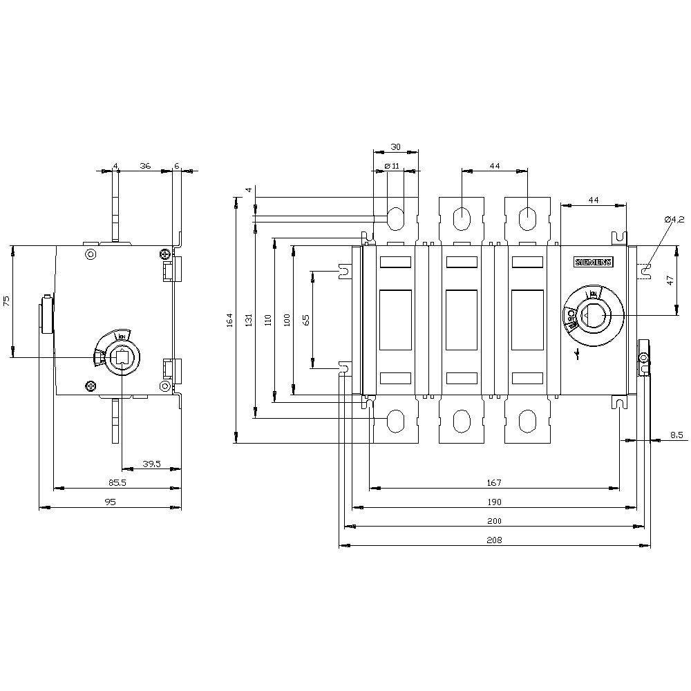 SIEMENS - Sezionatore sottocarico 200 A grand. costr. 3, a 3 poli, comando per parete laterale a destra, apparecchio di base 3KD36340PE400