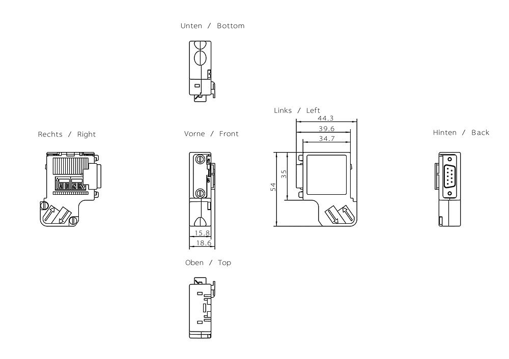 SIMATIC DP, connettore di bus per PROFIBUS con uscita cavo obliqua , max.1,5 mbaud, (L X A X P): 16 X 72,7 X 34 mm morsetti a perforazione di isolante, con attivabile, passiva chiusura di bus per circuito RS485-IS, senza presa di collegamento PG, impiego solo su apparecchi Ex I PROFIBUS Accessori per SIMATIC DP