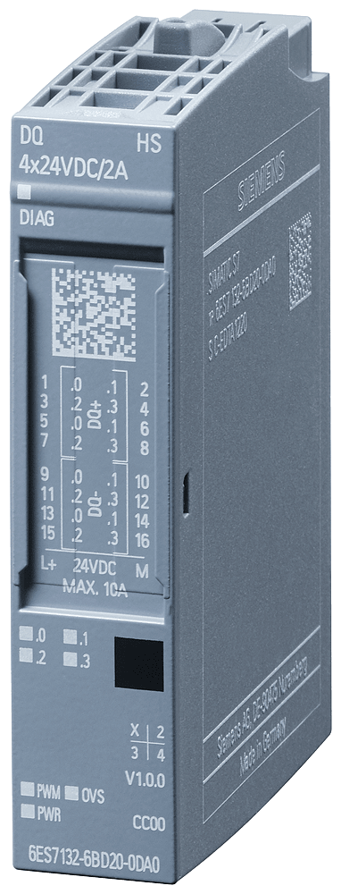 SIMATIC ET 200SP, Modulo di uscite digitali, DQ 4x 24VDC/2A High Speed, Quantità di pezzi nell'imballo 1 pezzo adatto per BU tipo A0, Codice colore CC00, 3 modi di funzionamento alternativi: DQ, oversampling, modulazione ampiezza impulsi Modulo diagnostica Con il SIMATIC ET 200SP, Siemens offre un sistema di periferia decentrata e multifunzionale che può essere facilmente messo in servizio grazie alla sua forma costruttiva salvaspazio. È omologato per il grado di protezione IP20 e progettato per l'installazione in una cassetta di distribuzione compatta. Il sistema assicura la massima flessibilità, consentendo di sostituire in ogni momento rapidamente e facilmente i moduli grazie al Multi Hot Swapping. Inoltre il SIMATIC ET 200SP vi offre una vasta gamma di canali di comunicazione, sia diversi che veloci. Grazie all'integrazione del modulo di interfaccia MultiFieldbus IM155-6MF, potete sempre reagire con flessibilità e utilizzare il protocollo ottimale per la vostra applicazione, poiché questa funzione supporta diversi protocolli Ethernet. Il montaggio e il service sono semplificati da un sistema di identificazione unitario, basato su targhette identificative di riferimento e sull'assegnazione dei pin con codifica a colori. Siemens vi assicura sistemi a prova di futuro con l'integrazione di prodotti di automazione innovativi e allo stesso tempo di lunga durata, infatti in qualità di esperti di settore investite già oggi nelle tecnologie di domani e ridefinite così gli standard di mercato. La continua disponibilità dei dati, la flessibilità dei casi applicativi e le versatili opzioni di integrazione assicurano le ottime prestazioni dei prodotti ET 200. La configurazione scalabile e ottimizzata a livello di costi di una stazione ET 200SP è garantita dall'ampia gamma di moduli I/O. Oltre alle unità di ingressi e uscite digitali e analogiche sono disponibili anche varianti fail-safe per applicazioni fino a SIL 3 / PLe. Ciò vale pure per gli avviatori motore integrati, che sono adatti per motori fino a 5,5 kW. Contatori di energia per la misura e l'analisi del consumo energetico, master IO-Link (V1.1.) nonché molti altri moduli di comunicazione e tecnologici permettono di adattare il sistema ad ogni compito di automazione. Gli accessori disponibili per ET 200SP vanno dalle targhette identificative di riferimento a colori e non a colori fino alle etichette di siglatura per i singoli moduli e assicurano la massima visibilità nel quadro elettrico.