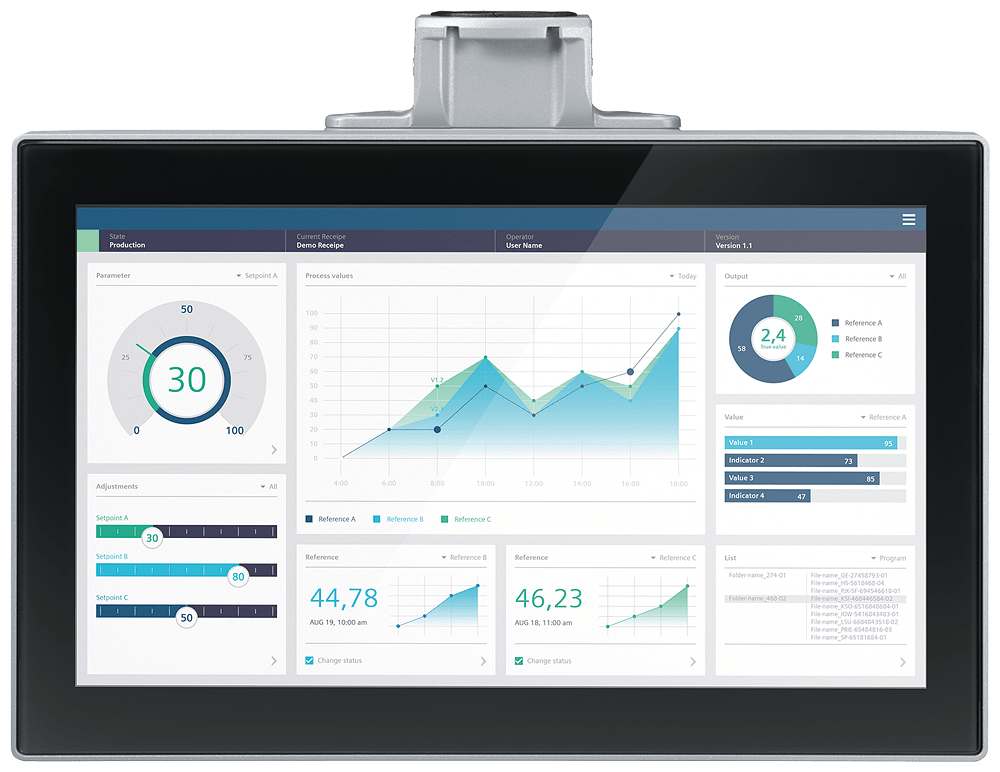 SIMATIC HMI MTP1500 PRO, per braccio di sostegno (non ampliabile, flangia in alto), frontale neutrale, display TFT widescreen da 15,6", 16 milioni di colori, interfaccia PROFINET, progettabile da WinCC Unified Comfort V18, comprende il software Open Source, che viene concesso gratuitamente I SIMATIC HMI Unified Comfort Panel PRO si contraddistinguono per l'elevato grado di protezione IP65 (NEMA4) e la varietà delle opzioni di montaggio (ad es. direttamente sulla macchina oppure su un piedistallo o su un sistema di bracci di sostegno). Tutte le apparecchiature, nelle dimensioni da 12 a 22 pollici, offrono il massimo comfort operativo grazie alla moderna tecnologia Multi-Touch e consentono di realizzare soluzioni di comando innovative basate sul nuovo software di visualizzazione SIMATIC WinCC Unified. La funzionalità delle apparecchiature è facilmente ampliabile, secondo le proprie esigenze, grazie alla funzionalità Edge integrata. Ogni Unified Comfort Panel PRO è disponibile in due varianti di design. Design standard: con i marchi Siemens e SIMATIC HMI nonché telaio in alluminio colore argento. Design neutrale: senza marchi e con telaio in alluminio colore nero. I limiti del sistema sono identici a quelli degli Unified Comfort Panel (apparecchiature da incasso) e sono stati almeno raddoppiati, in parte persino triplicati, rispetto al modello precedente.
