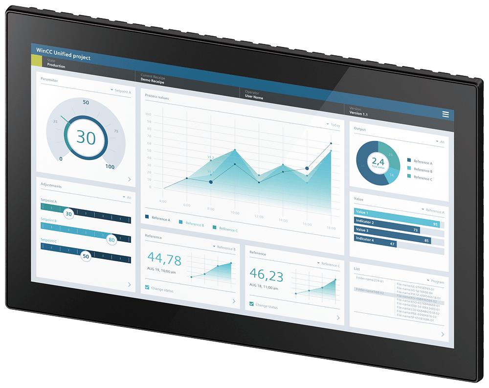 SIMATIC HMI MTP1900, Unified Comfort Panel, neutrale, comando touch, display TFT widescreen da 18,5", 16 milioni di colori, interfaccia PROFINET, progettabile da WinCC Unified Comfort V16, comprende il software Open Source che viene concesso gratuitamente, vedere il DVD allegato SIMATIC HMI Unified Comfort Panel consentono di realizzare soluzioni di comando innovative basate sul nuovo software di visualizzazione SIMATIC WinCC Unified. Tutti gli apparecchi, nelle dimensioni da 7 a 22 pollici, sono dotati dello stesso numero di interfacce e del massimo comfort operativo grazie alla moderna tecnologia Multi-Touch. Inoltre il nuovo hardware offre una potenza notevolmente superiore per la visualizzazione. Le capacità limite del sistema sono state almeno raddoppiate, se non persino triplicate. Questo permette di realizzare applicazioni di dimensioni notevolmente maggiori rispetto a quelle realizzate finora su un sistema con Panel. La funzionalità delle apparecchiature è facilmente ampliabile, secondo le proprie esigenze, grazie alla funzionalità Edge integrata. Per garantire la sicurezza IT delle apparecchiature, Siemens ha scelto un sistema operativo proprietario e consente all'utente di disattivare le funzioni o le interfacce non richieste. Ogni Unified Comfort Panel è disponibile in due varianti di design. Design standard: con i marchi Siemens e SIMATIC HMI nonché telaio in alluminio colore argento. Design neutrale: senza marchi e con telaio in alluminio colore nero.