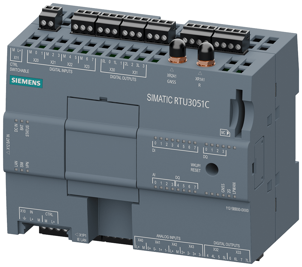 SIEMENS - SIMATIC RTU3051C compatta Low-Power RTU; funzionante a batteria oppure con energia fotovoltaica; collegamento alimentazione di tensione est. DC 10,...