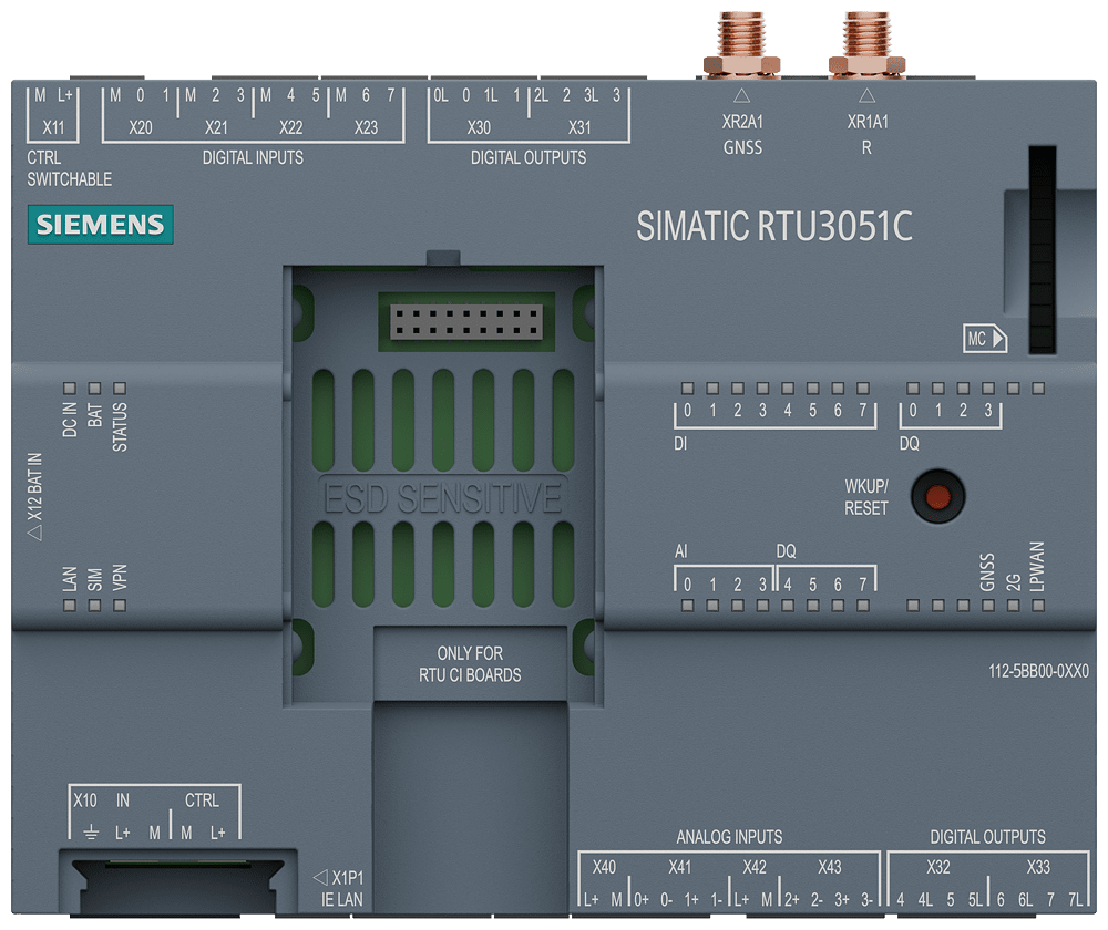 SIEMENS - SIMATIC RTU3051C compatta Low-Power RTU; funzionante a batteria oppure con energia fotovoltaica; collegamento alimentazione di tensione est. DC 10,... 6NH31125BB000XX0