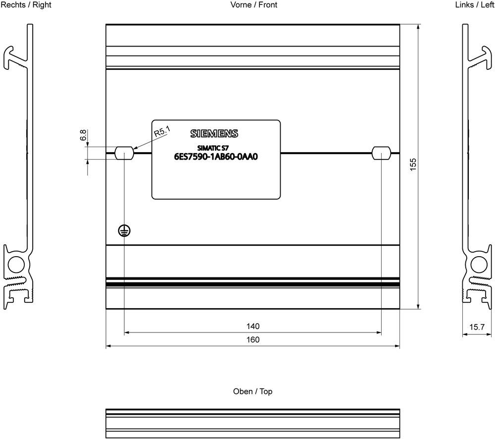 SIEMENS - SIMATIC S7-1500 Guida profilata 160 mm (6,3) incl. vite di messa a terra 6ES75901AB600AA0