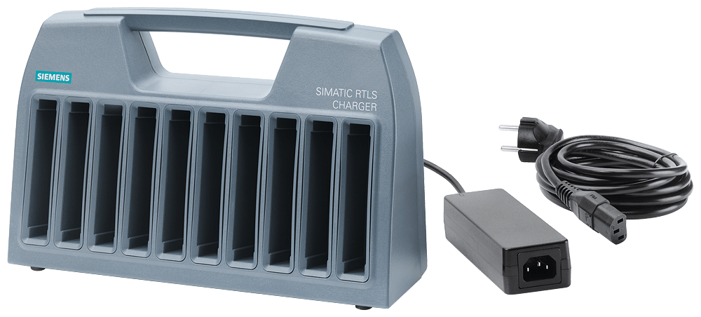 accessori SIMATIC RTLS stazione di carica per transponder, In: AC: 100 ... 240 V, con connettore di rete CEE 7/7 per la ricarica contemporanea di 10 Tag del tipo RTLS4083T e RTLS4040T. stazione di ricarica con alimentatore da rete RTLS4083T, 4040T, UE