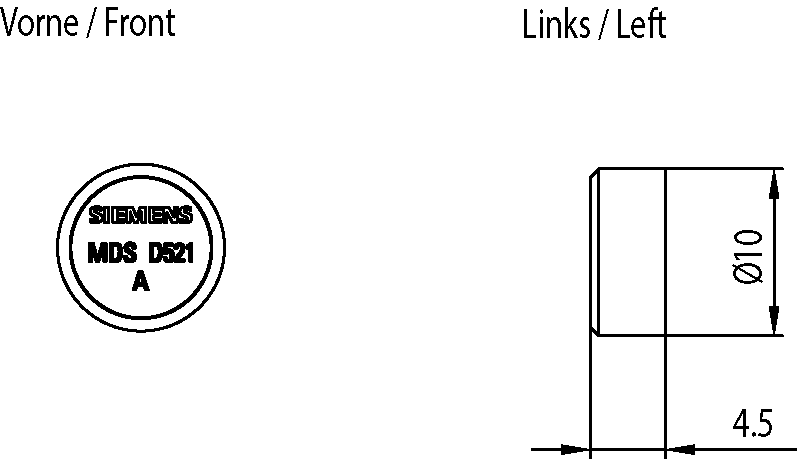 transponder MDS D521 solo per RF200/RF300 Gen2 elemento in pastiglia in metallo, ISO 15693, tipo di chip FUJITSU MB89R112, 8192 byte FRAM memoria utente 10x 4,5 mm (DxA); min. quantità ordinabile 10 pezzi. SIMATIC RFTransponder MDS D521