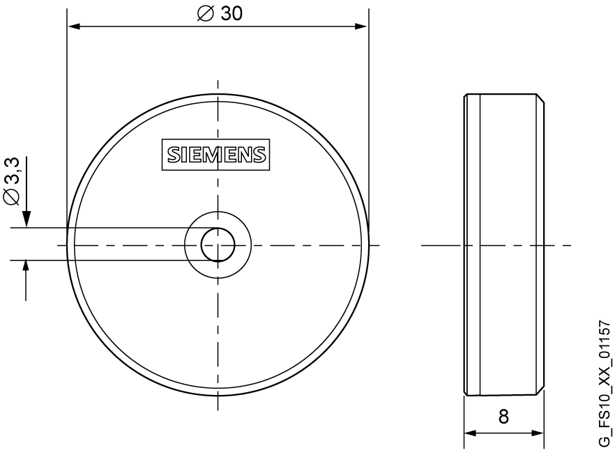 SIMATIC RF625T Disk Tag; 30x 8 mm (DxA); On-Metal transponder ISO 18000-6C, EPC Classe 1 Gen 2, frequenza 865 ... 868 MHz (ETSI), tipo di chip IMPINJI MONZA 4QT, EPC 128 bit, 64 byte memoria aggiuntiva, min. quantità ordinabile 10 pezzi. SIMATIC RFTransponder RF625T