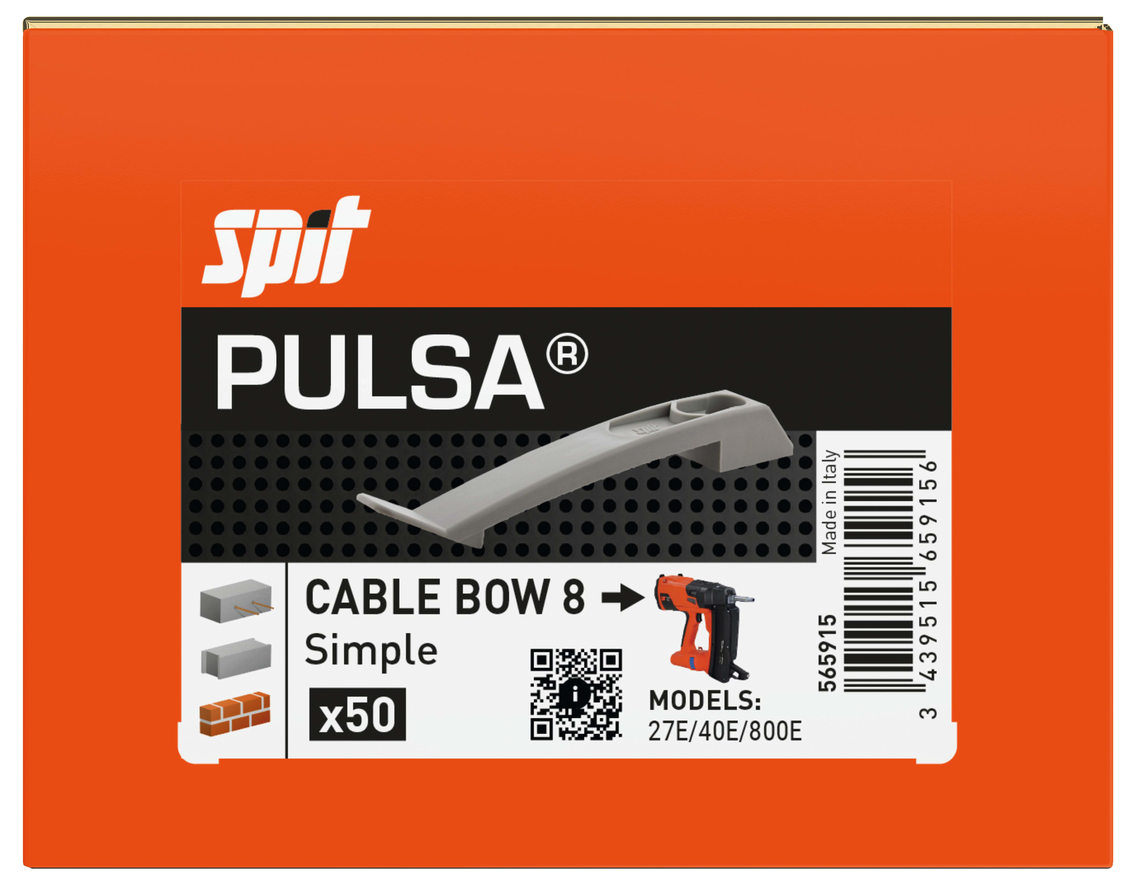 Archetti passacavo singoli e doppi per fissaggio a soffitto di cavi a bassa tensione in sospensione. Risparmia tempo e denaro con gli accessori pulsabili. Aggancio facilitato alla canna della chiodatrice Pulsa versione E che consente maggiore sicurezza in fase di fissaggio;. Versatilità d'uso: fissaggi con una sola mano;. Realizzata in copolimero, l'archetto passacavi è concepito appositamente per essere compatibile con le chiodatrici Pulsa E; . Fissabile anche con tassello leggero con vite;. Test del filo incandescente ISO CEI 695-2 fino a 650°C.. Per il fissaggio di massimo 8 cavi di dimensione 3x1,5mm per archetto singolo e di 16 cavi di dimensione 3x1,5 mm per archetto doppio;. Specifico per fissaggi a soffitto;.