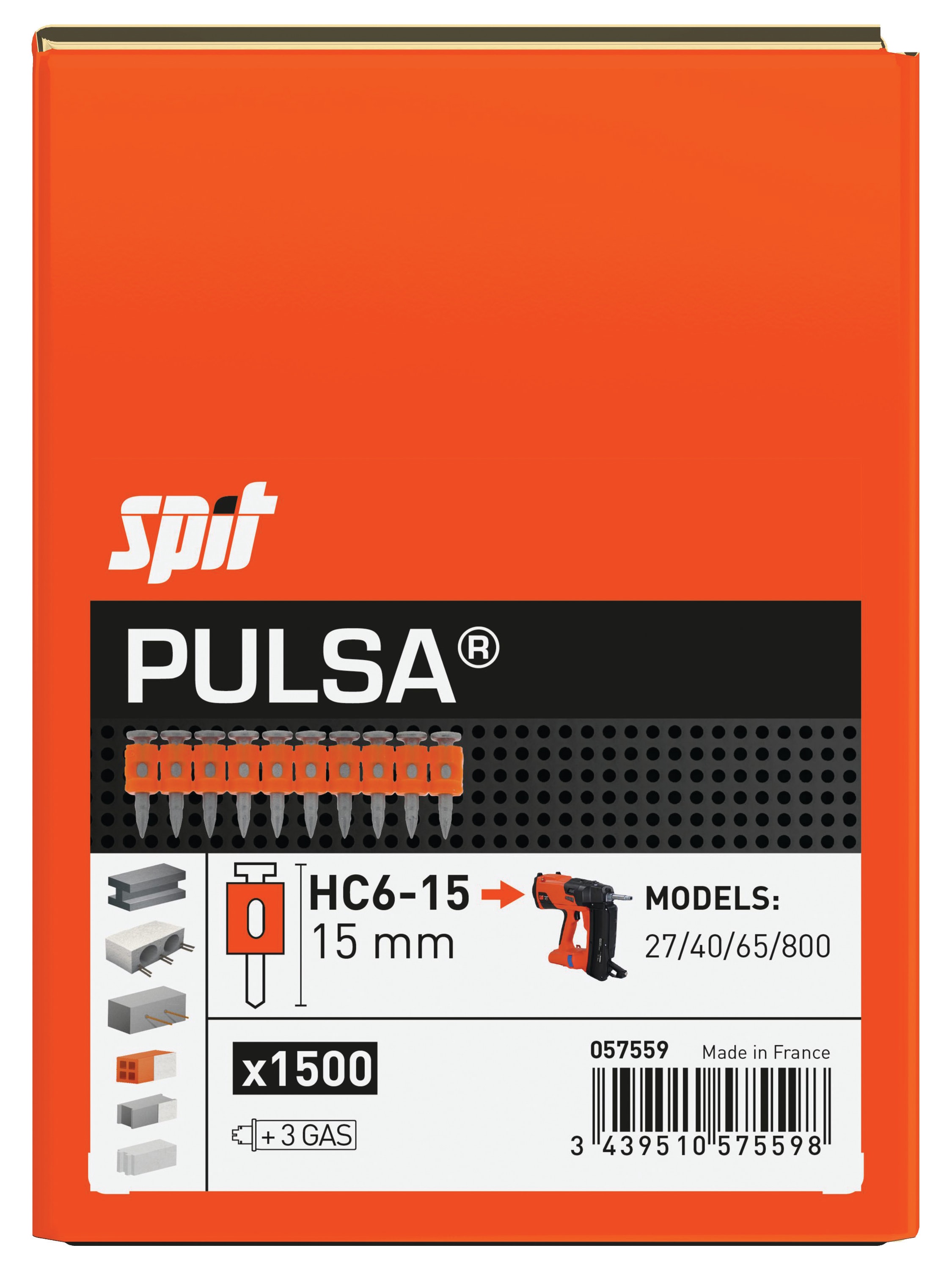 Chiodi ad alte prestazioni per acciaio, calcestruzzo duro, anche precompresso. Confezionati con bombolette di gas.. Chiodi di massima qualità, assicurano alta percentuale di successo. Chiodi ad alte prestazioni per acciaio, calcestruzzo duro;. Elevata durezza, geometria e design specifici che garantiscono la migliore penetrabilità nel calcestruzzo duro;. Ogni scatola di chiodi viene fornita con una bomboletta di gas;. Strisce da 10 chiodi ciascuna compatibili con i caricatori Pulsa da 20, 30 e 50 chiodi;. Chiodo disponibile in diverse lunghezze da 15mm sino a 65mm;. Chiodi compatibili con le chiodatrici Pulsa 27, 40 65 e 800..