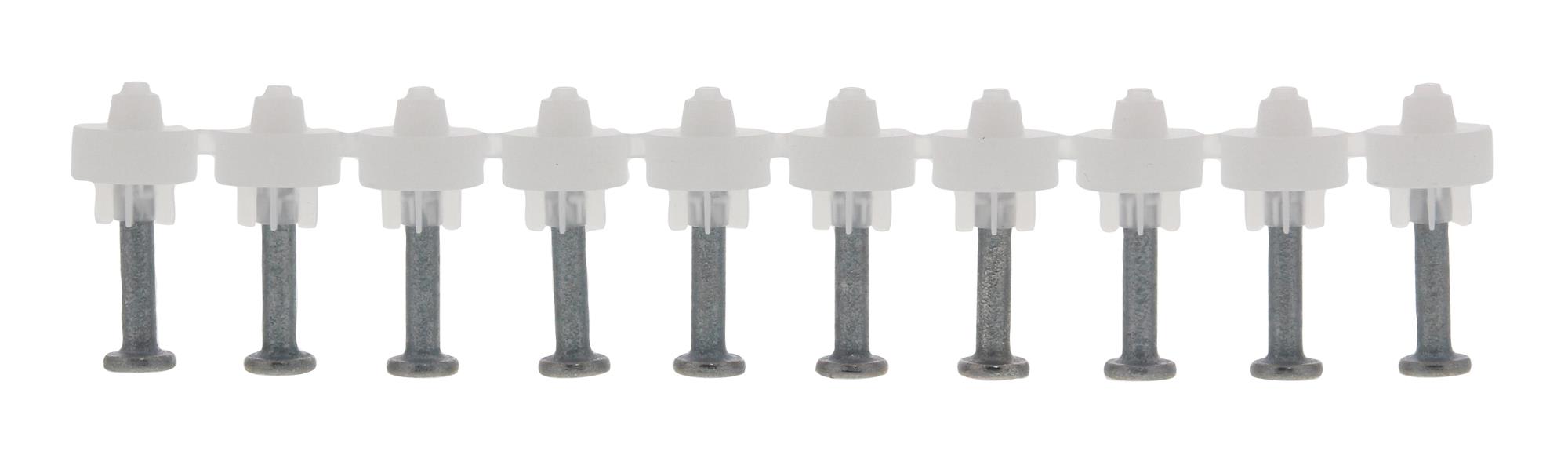 Chiodi con rondella, per fissaggio di canaline in pvc preforate su materiali duri. Confezionati con bombolette di gas.. Abbrevia i tempi di fissaggio di componenti fragili. Chiodi progettati per l'uso con canaline in PVC preforate, con ampiezza del foro fino a 8,0 mm;. La rondella in plastica assorbe l'impatto, protegge la canalina in materiale plastico e copre la testa del chiodo;. L’estremità conica dell’ammortizzatore permette il puntamento nei fori predisposti;. Chiodi per applicazioni su calcestruzzo duro e acciaio;. Chiodo per carica frontale, da caricare uno-ad-uno, utilizzabile con il caricatore a tiro singolo presente nella valigetta Pulsa (non adatto per l'uso con il caricatore standard);. Ogni confezione comprende una bomboletta di gas..
