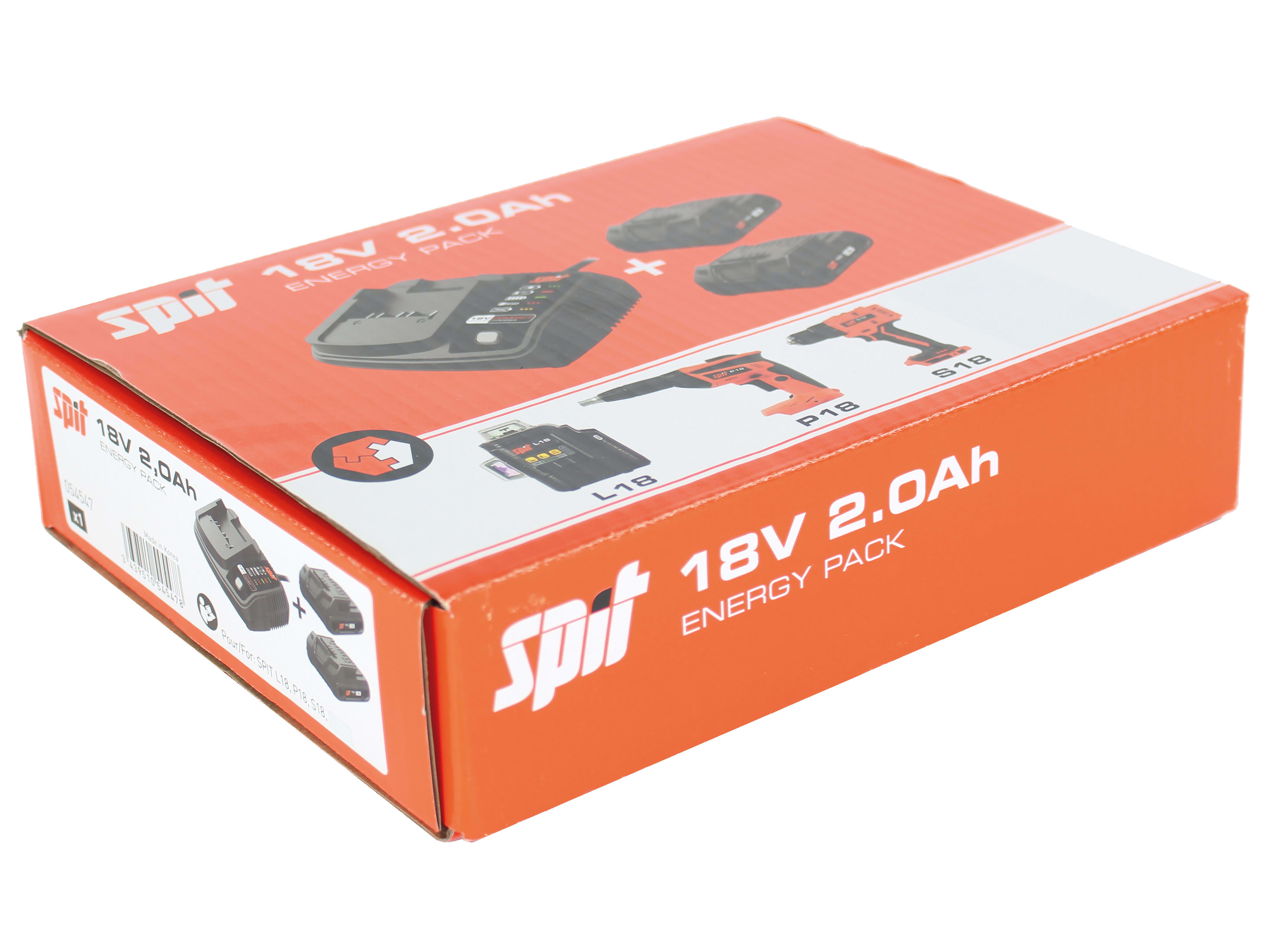 Energy Pack 2Ah per gamma Spit Cordless Essentials 18V. Pack batterie (2) e caricabatterie compact per gamma 18V. 2 batterie 18V - 2Ah. 1 caricatore compact. Compatibile con: L18, S18, P18.