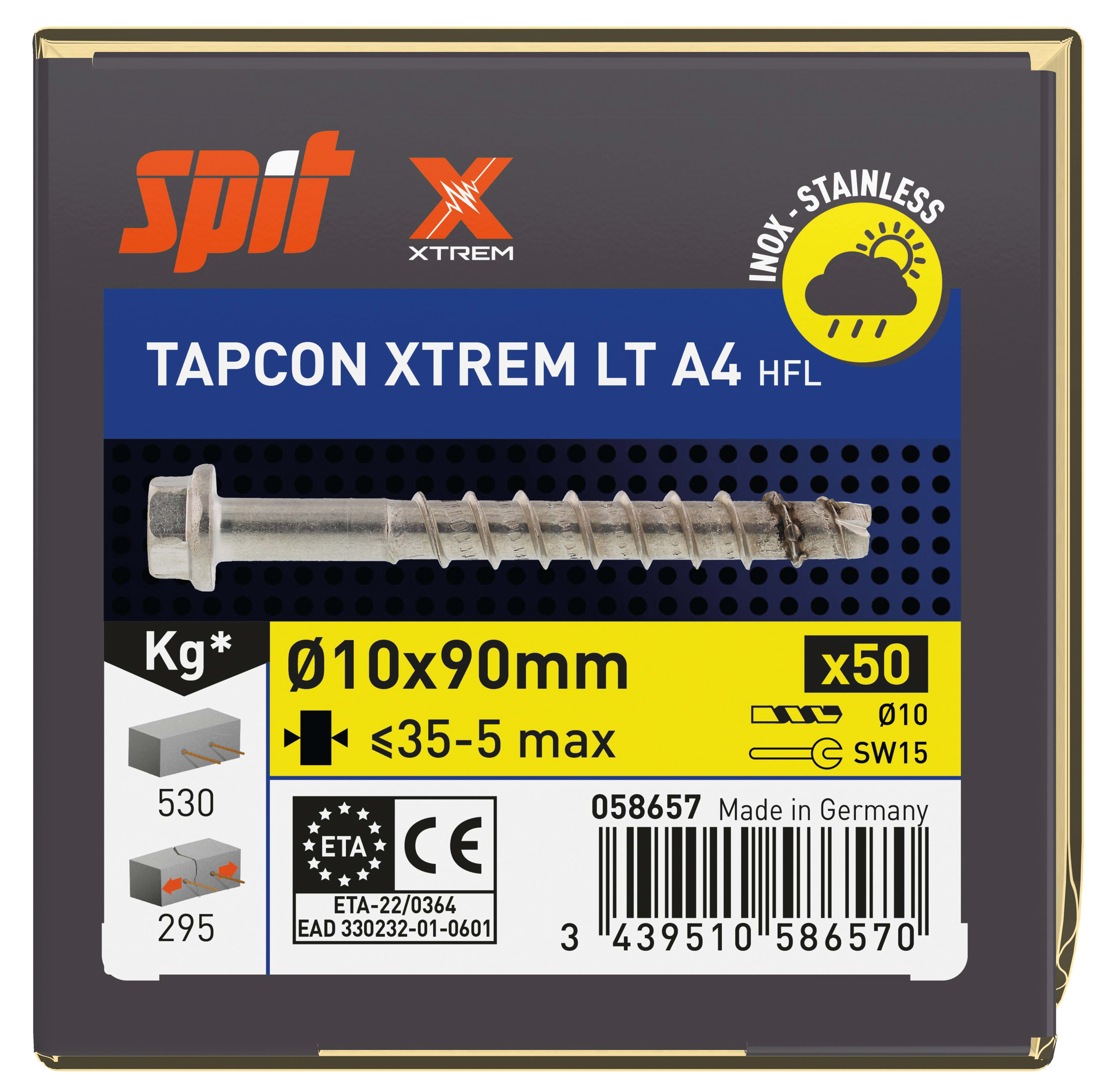 Ancorante a vite in acciaio inox per calcestruzzo per fissaggi ad alte prestazioni per distanze ed interassi ridotti e in zona sismica. Testa esagonale flangiata. Ancorante per calcestruzzo ad alte prestazioni, qualificato con ETA per Prestazione Sismica. Gamma con ETA, approvata per calcestruzzo fessurato e non-fessurato. Gamma TAPCON XTREM, utilizzabile e approvata per prestazione sismica C1. Certificato per la resistenza al fuoco. La maggior lunghezza effettiva della filettatura permette le prestazioni più alte del mercato. Disponibile in acciaio trattato con zincatura resistente a 500 h alla prova in nebbia salina o in acciaio inossidabile A4. Le viti TAPCON possono essere rapidamente rimosse e sono ideale per fissaggi temporanei. Ampia scelta di diametri di foratura, tipologie di testa e lunghezze per diverse necessità applicative. Canalizzazioni elettriche. Canali o tubazioni sospese. Puntelli per casseforme in acciaio. Controsoffitti sospesi. Fissaggi temporanei di cantiere. Ponteggi sospesi. Segnaletica stradale. Barriere di sicurezza. Sediolini da stadio. Scafflature industriali. Impianti ed apparecchiature. Canalizzazioni metalliche. Telai di serramenti. Ringhiere. Impianti di ventilazione/condizionamento.