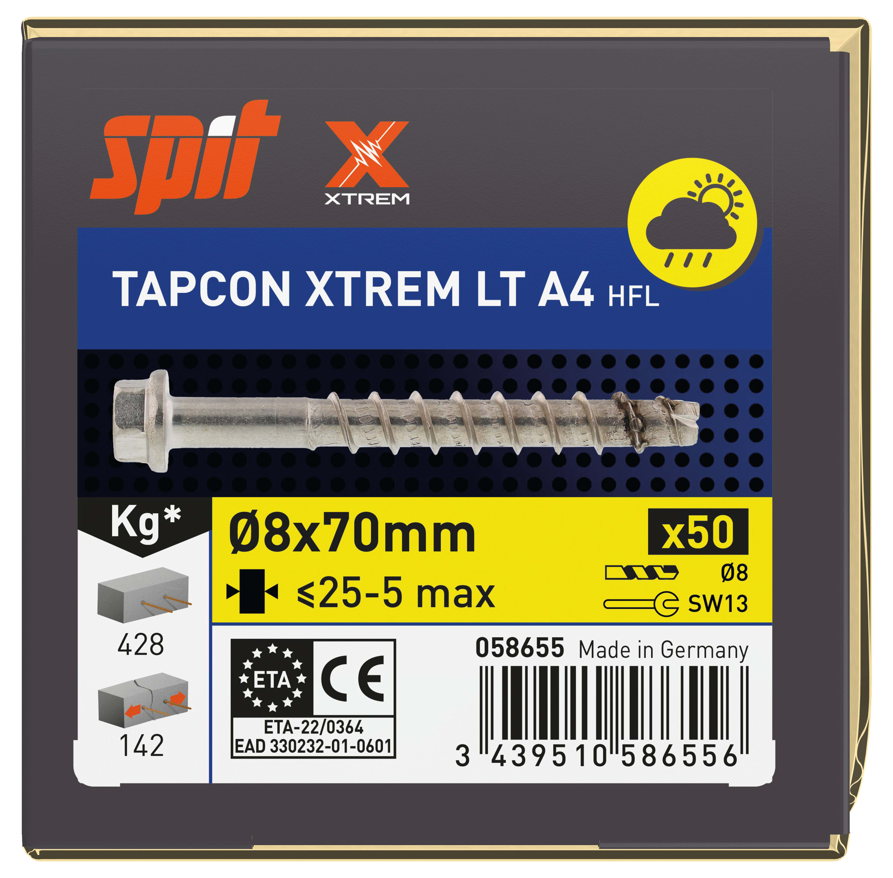 Ancorante a vite in acciaio inox per calcestruzzo per fissaggi ad alte prestazioni per distanze ed interassi ridotti e in zona sismica. Testa esagonale flangiata. Ancorante per calcestruzzo ad alte prestazioni, qualificato con ETA per Prestazione Sismica. Gamma con ETA, approvata per calcestruzzo fessurato e non-fessurato. Gamma TAPCON XTREM, utilizzabile e approvata per prestazione sismica C1. Certificato per la resistenza al fuoco. La maggior lunghezza effettiva della filettatura permette le prestazioni più alte del mercato. Disponibile in acciaio trattato con zincatura resistente a 500 h alla prova in nebbia salina o in acciaio inossidabile A4. Le viti TAPCON possono essere rapidamente rimosse e sono ideale per fissaggi temporanei. Ampia scelta di diametri di foratura, tipologie di testa e lunghezze per diverse necessità applicative. Canalizzazioni elettriche. Canali o tubazioni sospese. Puntelli per casseforme in acciaio. Controsoffitti sospesi. Fissaggi temporanei di cantiere. Ponteggi sospesi. Segnaletica stradale. Barriere di sicurezza. Sediolini da stadio. Scafflature industriali. Impianti ed apparecchiature. Canalizzazioni metalliche. Telai di serramenti. Ringhiere. Impianti di ventilazione/condizionamento.
