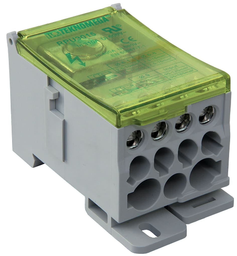 La gamma ? BLOCK TEKNOMEGA è decisamente articolata e completa, composta da ripartitori a morsettiera, monoblocco e compatti. Consente la realizzazione di distribuzioni a partire da 40 A fino a 500 A.