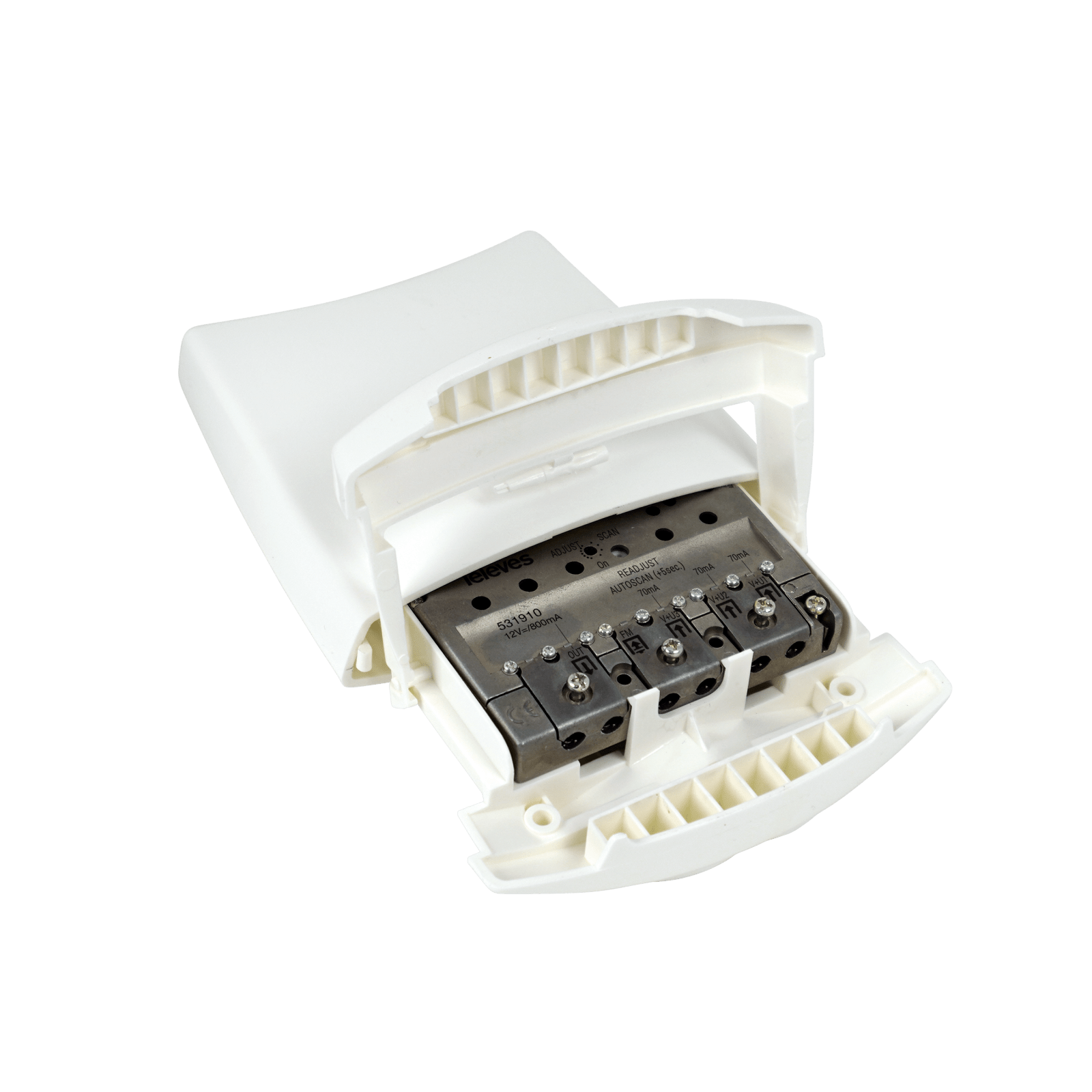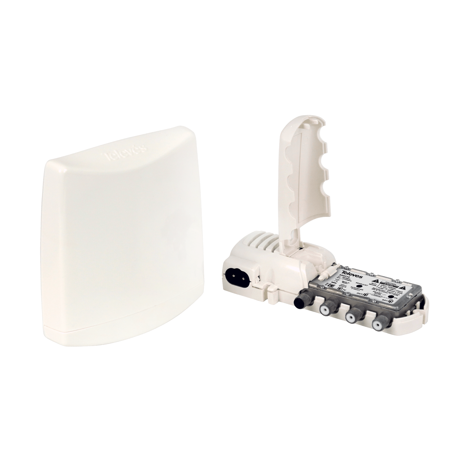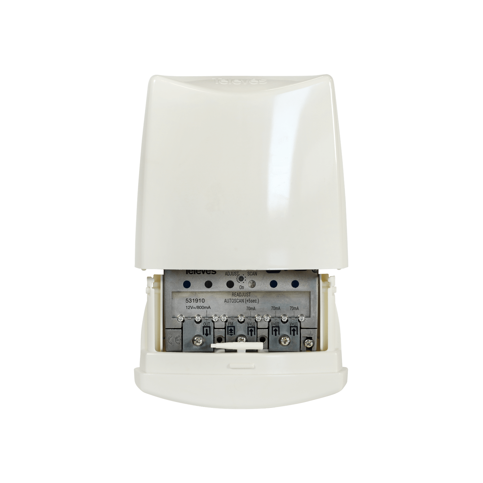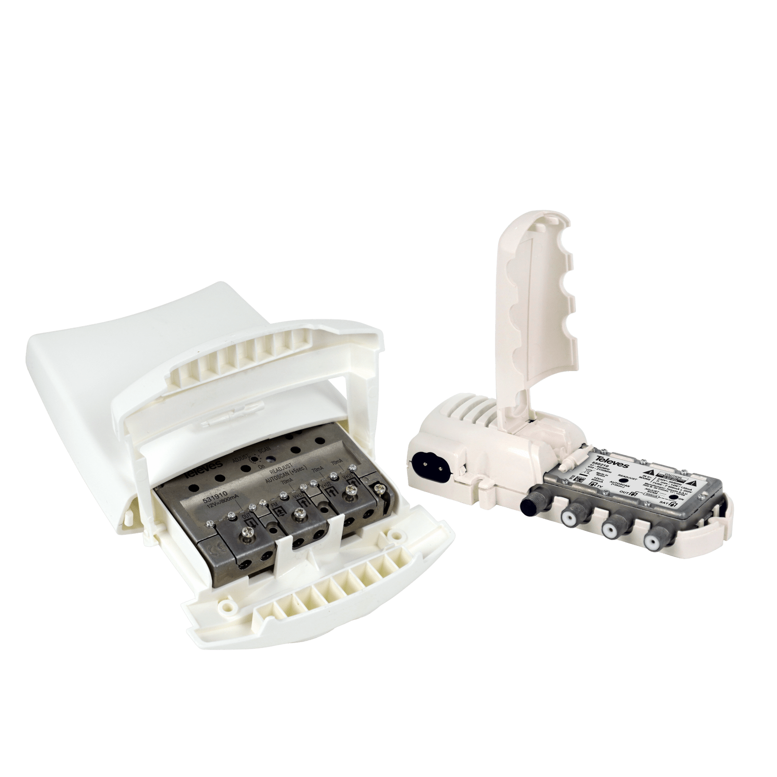 Amplificatore da palo intelligente SmartKom Autoprogrammazione o programmazione manuale tramite Bluetooth® (ASuite). Amplificatore compatto e intelligente per l'installazione a palo con elaborazione digitale dei canali, progettato per villette singole. Dotato di 3 ingressi per amplificare i segnali terrestri (VHF+UHF) in cui ogni canale può essere filtrato individualmente da uno qualsiasi dei 32 filtri programmabili disponibili. Inoltre, include un ingresso per miscelare la radio FM. L'amplificatore viene fornito con un alimentatore domestico da 12V (800mA) che viene inserito nell'impianto tramite il cavo coassiale e lo alimenta attraverso il suo connettore di uscita.La funzione di autoprogrammazione dell'amplificatore conferisce a questo dispositivo la possibilità di programmarsi e regolarsi da solo semplicemente premendo un pulsante. Inoltre, grazie all'antenna Bluetooth® inclusa nell'alimentatore, la programmazione manuale o automatica dell'amplificatore può essere effettuata in modalità wireless tramite smartphone o tablet (Android e iOS), con l'applicazione ASuite.RED compliant . Dispositivo ''All-in-one'': unisce le funzioni di diversi elementi di un impianto come filtri, mixer e amplificatori, fornendo una distribuzione completa del segnale tramite un unico cavo coassiale. PlugandPlay: l'amplificatore programma e regola automaticamente il livello del canale premendo il pulsante di autoprogrammazione, oltre ad attivare l’alimentazione dell’antenna quando rileva che il segnale lo richiede. Elaborazione digitale dei canali: in uscita si ottiene un perfetto bilanciamento del livello del segnale tra i diversi canali. Regolazione automatica del guadagno del segnale in ogni filtro (AGC). Ottima qualità del segnale: l'installazione di questo dispositivo subito dopo L'antenna intelligente di Televés previene il degrado del segnale e garantisce la migliore qualità. Filtri digitali ad alta selettività (28dB@1MHz). Filtro SAW (Surface Acoustic Wave) incluso per un'elevato taglio delle interferenze telefoniche 4G/5G. Alimentatore da interno incluso, con antenna Bluetooth® per la programmazione manuale wireless dell'amplificatore. Programmazione manuale o automatica wireless (via Bluetooth®) tramite smartphone o tablet (Android e iOS) con l'app ASuite, evitando di doverlo fare fisicamente sul palo. Configurazione sicura: in caso di guasto elettrico, SmartKom tiene in memoria la configurazione. Alto livello di uscita. Sistema di connessione EasyF: un sistema affidabile e sicuro, che fa risparmiare tempo per l'installazione e senza la necessità di connettori aggiuntivi. Indicatori LED che mostrano sia lo stato di regolazione che di programmazione sull'amplificatore e sull'alimentatore. Telaio ad alta schermatura, realizzato in Zamak. È inclusa una custodia in plastica ABS arancione per fornire una maggiore resistenza alle condizioni meteorologiche per l'installazione all'aperto. 100% design e produzione europea: produzione completamente automatizzata e sottoposta a rigorosi controlli di qualità.