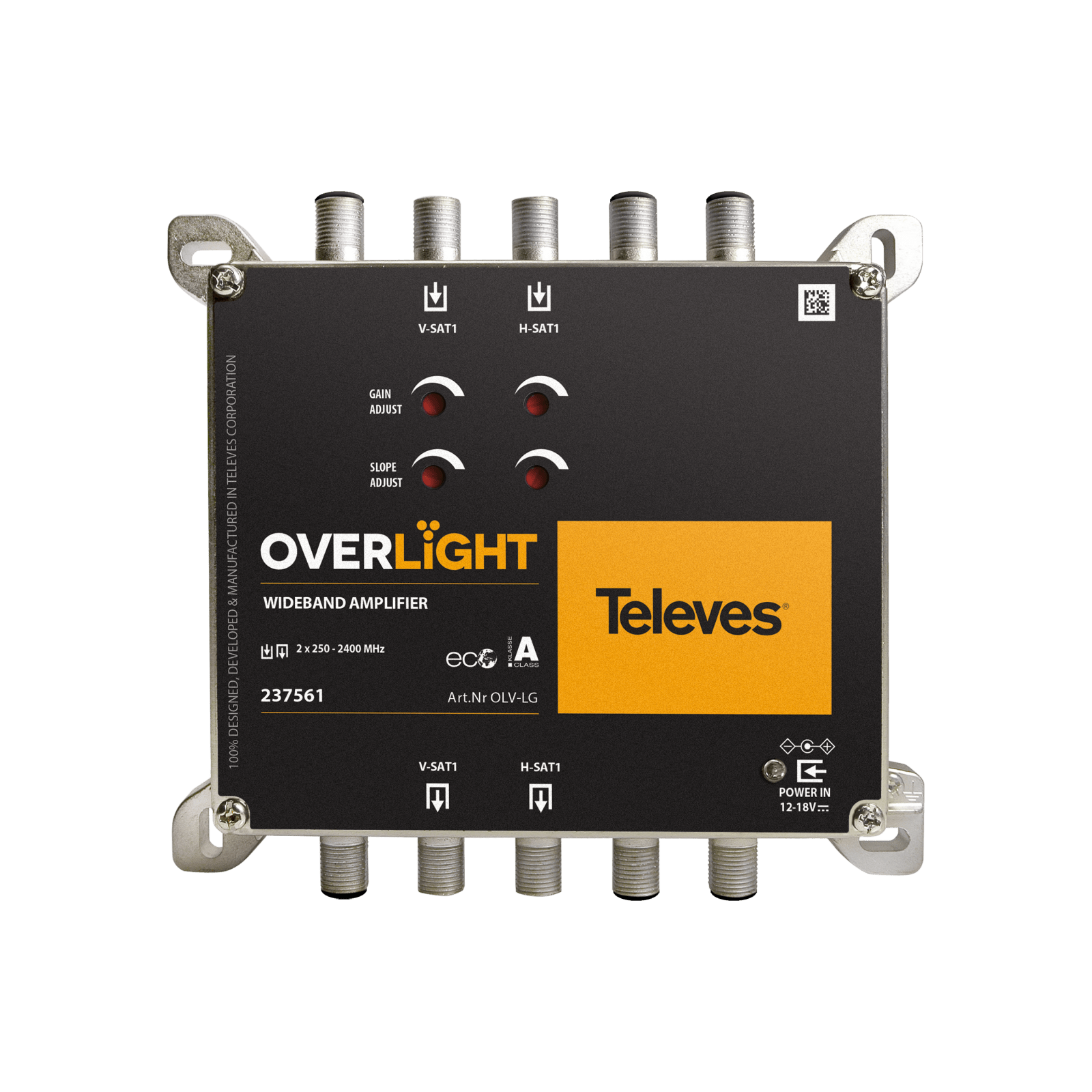 Amplificatore Overlight WideBand 13 dB, (1 satellite) 250...2400 MHz. Amplificatore compatto WideBand per installazioni Overlight a 1 satellite. Consente di compensare le perdite del cavo coassiale nell'impianto. Questo amplificatore può essere alimentato dal trasmettitore Overlight o da un alimentatore esterno. Guadagno massimo fino a 13 dB. È dotato di 2 ingressi (H/V) WideBand e 2 uscite (H/V) WideBand (250-2400 MHz). Uso interno. . Guadagno indipendente e controllo della pendenza (tilt). Alimentazione da 12 V a 18 V tramite il connettore Jack o tramite il trasmettitore Overlight. Dimensioni molto leggeri e compatte (137x120x30mm). Design, qualità e produzione europei al 100%. Connettori RF di tipo F. Telaio in Zamak ad alta schermatura. Montaggio a parete tramite viti.