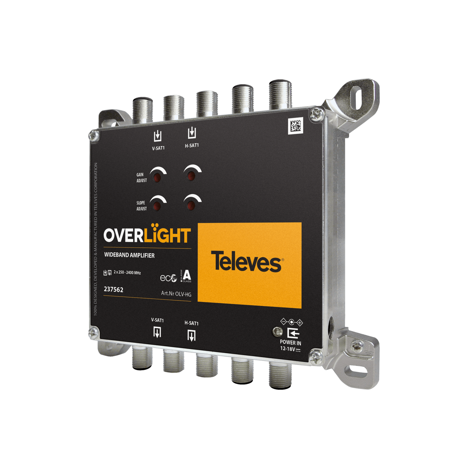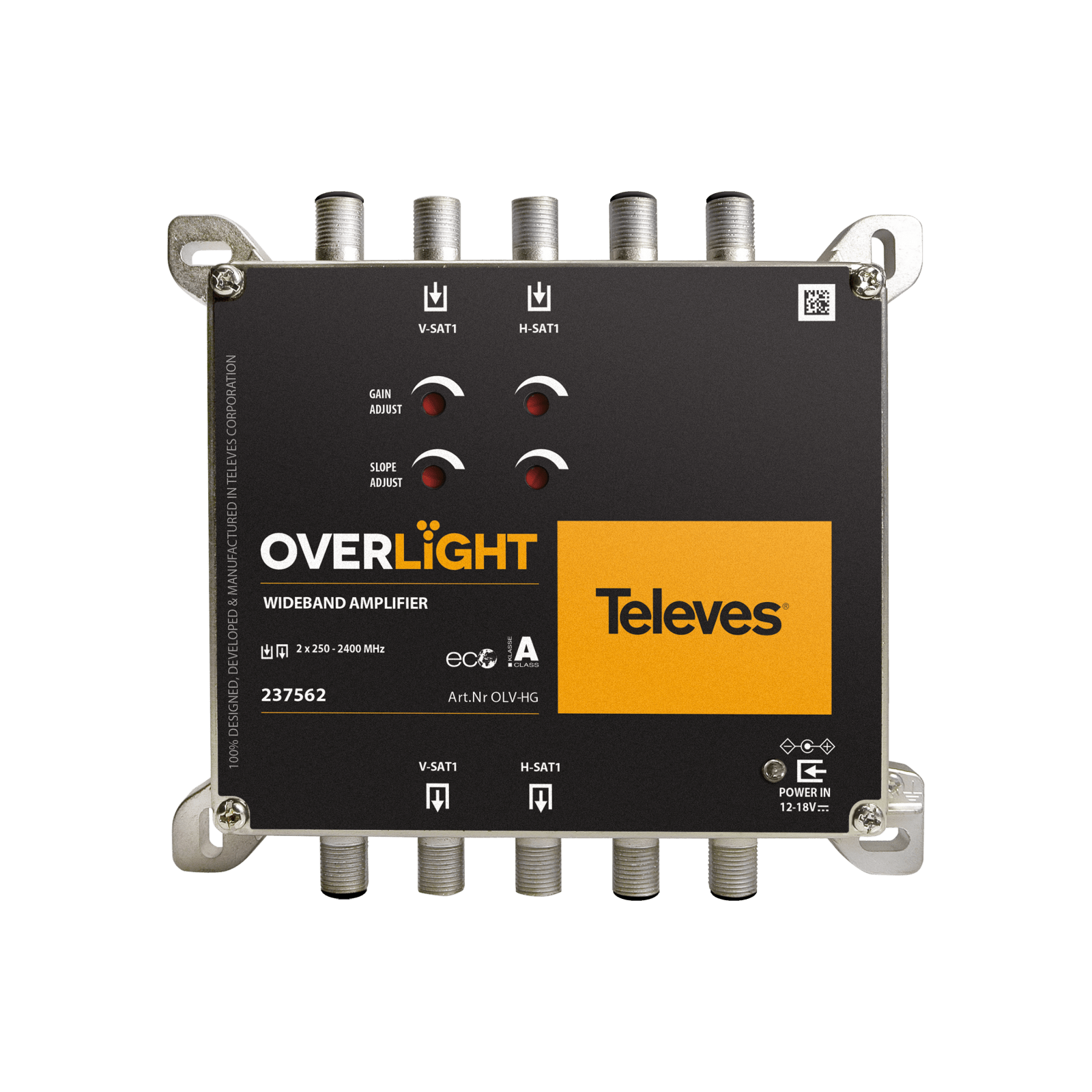 Amplificatore Overlight WideBand 29 dB, (1 satellite) 250...2400 MHz. Amplificatore compatto WideBand per installazioni Overlight a 1 satellite. Consente di compensare le perdite del cavo coassiale nell'impianto. Questo amplificatore può essere alimentato dal trasmettitore Overlight o da un alimentatore esterno. Guadagno massimo fino a 29 dB. È dotato di 2 ingressi (H/V) WideBand e 2 uscite (H/V) WideBand (250-2400 MHz). Uso interno. . Guadagno indipendente e controllo della pendenza (tilt). Alimentazione da 12 V a 18 V tramite il connettore Jack o tramite il trasmettitore Overlight. Dimensioni molto leggeri e compatte (137x120x30mm). Design, qualità e produzione europei al 100%. Connettori RF di tipo F. Telaio in Zamak ad alta schermatura. Montaggio a parete tramite viti.