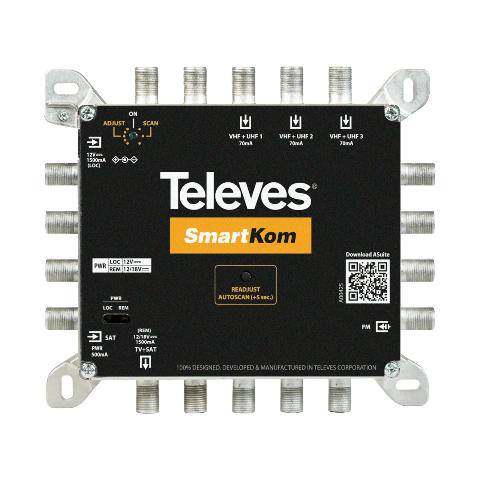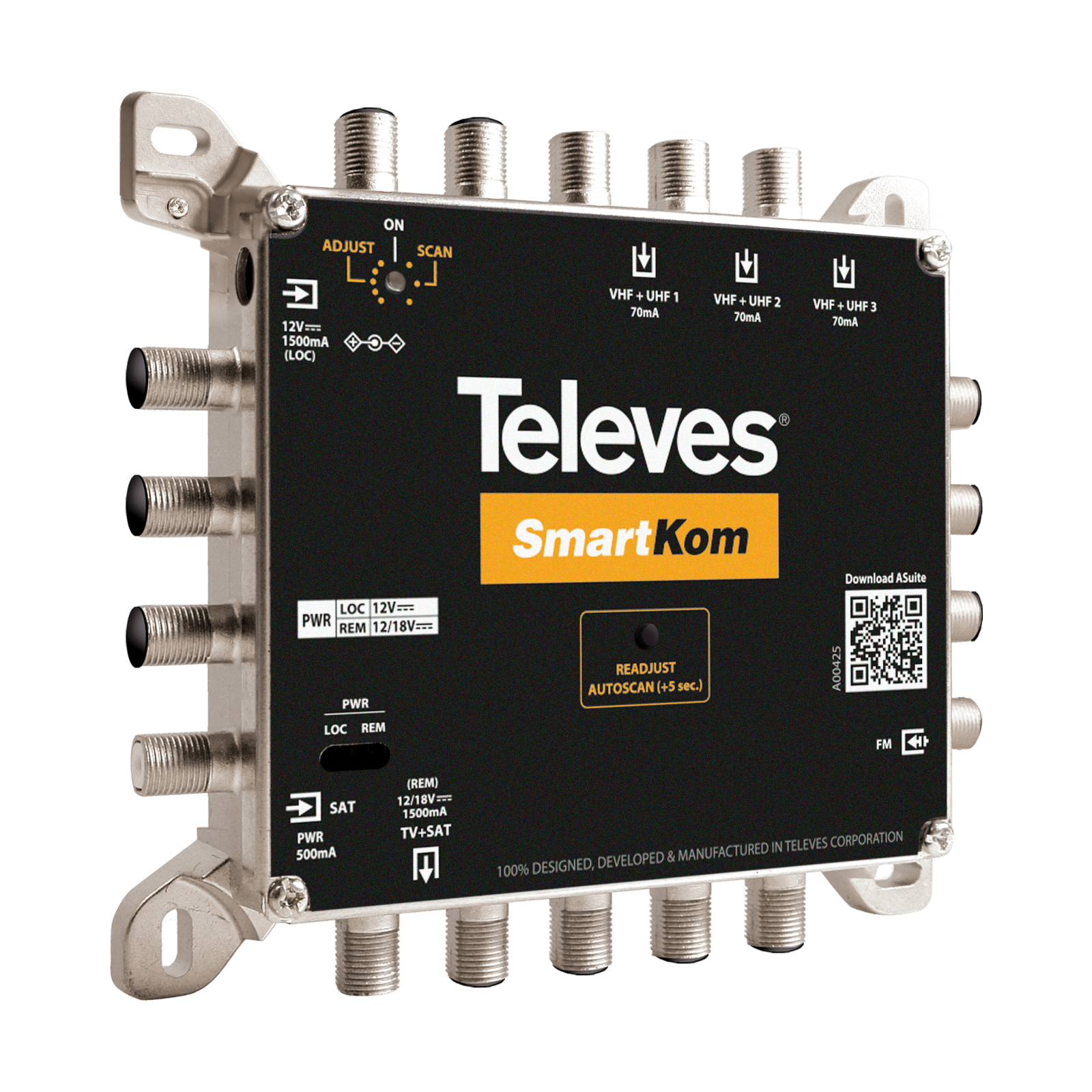 Amplificatore intelligente SmartKom dCSS Autoprogrammazione o programmazione manuale tramite Bluetooth® (ASuite). Amplificatore compatto e intelligente con elaborazione digitale dei canali, progettato per l'installazione all'interno di villette singole. Dotato di 3 ingressi per amplificare i segnali terrestri (VHF+UHF) in cui ogni canale può essere filtrato individualmente da uno qualsiasi dei 32 filtri programmabili disponibili. Inoltre, include ingressi per la miscelazione dei segnali satellitari e radio FM. Il dispositivo può essere alimentato a distanza tramite il connettore di uscita, collegato ad una rete domestica o tramite i cavi sul montante di un impianto di distribuzione con i MSW dCSS già alimentati. L'alimentazione locale viene fatta tramite un alimentatore esterno (Art. 732101 consigliato) con connettore jack.La funzione di autoprogrammazione dell'amplificatore conferisce a questo dispositivo la possibilità di programmarsi e regolarsi da solo semplicemente premendo un pulsante. Inoltre, grazie all'antenna Bluetooth® integrata, la programmazione manuale o automatica dell'amplificatore può essere effettuata in modalità wireless tramite smartphone o tablet (Android e iOS), con l'applicazione ASuite.RED compliant . Dispositivo ''All-in-one'': unisce le funzioni di diversi elementi di un impianto come filtri, mixer e amplificatori, fornendo una distribuzione completa del segnale tramite un unico cavo coassiale. PlugandPlay: l'amplificatore programma e regola automaticamente il livello del canale premendo il pulsante di autoprogrammazione, oltre ad attivare l’alimentazione dell’antenna quando rileva che il segnale lo richiede. Elaborazione digitale dei canali: in uscita si ottiene un perfetto bilanciamento del livello del segnale tra i diversi canali. Regolazione automatica del guadagno del segnale in ogni filtro (AGC). Filtri digitali ad alta selettività (28dB@1MHz). Filtro SAW (Surface Acoustic Wave) incluso per un'elevato taglio delle interferenze telefoniche 4G/5G. Alimentazione remota tramite il connettore coassiale di uscita collegato ad un alimentatore domestico inserito nell'impianto o tramite i cavi sul montante in un impianto di distribuzione con MSW dCSS già alimentati, oppure alimentazione locale tramite alimentatore esterno con connettore Jack. Programmazione manuale o automatica wireless (via Bluetooth®) tramite smartphone o tablet (Android e iOS) con l'app ASuite. Configurazione sicura: in caso di guasto elettrico, SmartKom tiene in memoria la configurazione. Alto livello di uscita. Connettori tipo ''F''. Indicatori LED sull'amplificatore che mostrano sia la regolazione che lo stato di programmazione . Telaio ad alta schermatura, realizzato in Zamak. 100% design e produzione europea: produzione completamente automatizzata e sottoposta a rigorosi controlli di qualità.
