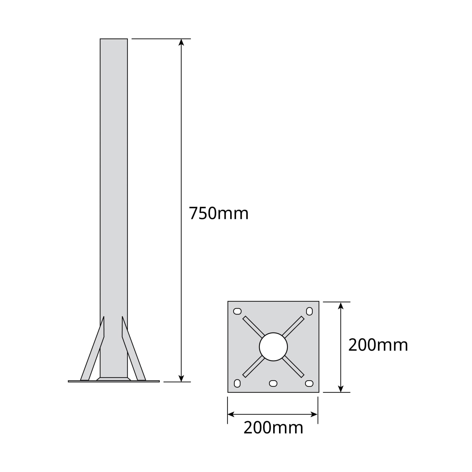 Supporto ''T'' 750x200mm Zinco + RPR. Supporto tubolare tipo ''T invertita'' per l'installazione di antenne a terra (avvitabile), con altezza di 750mm. Il tubo ha Ø 60mm e spessore 2,9mm. Realizzato in acciaio ad elevata resistenza alla corrosione, grazie al doppio trattamento galvanizzato e sigillatura a reagente (RPR). . Trattamento zincato + RPR: Elevata resistenza alla corrosione.