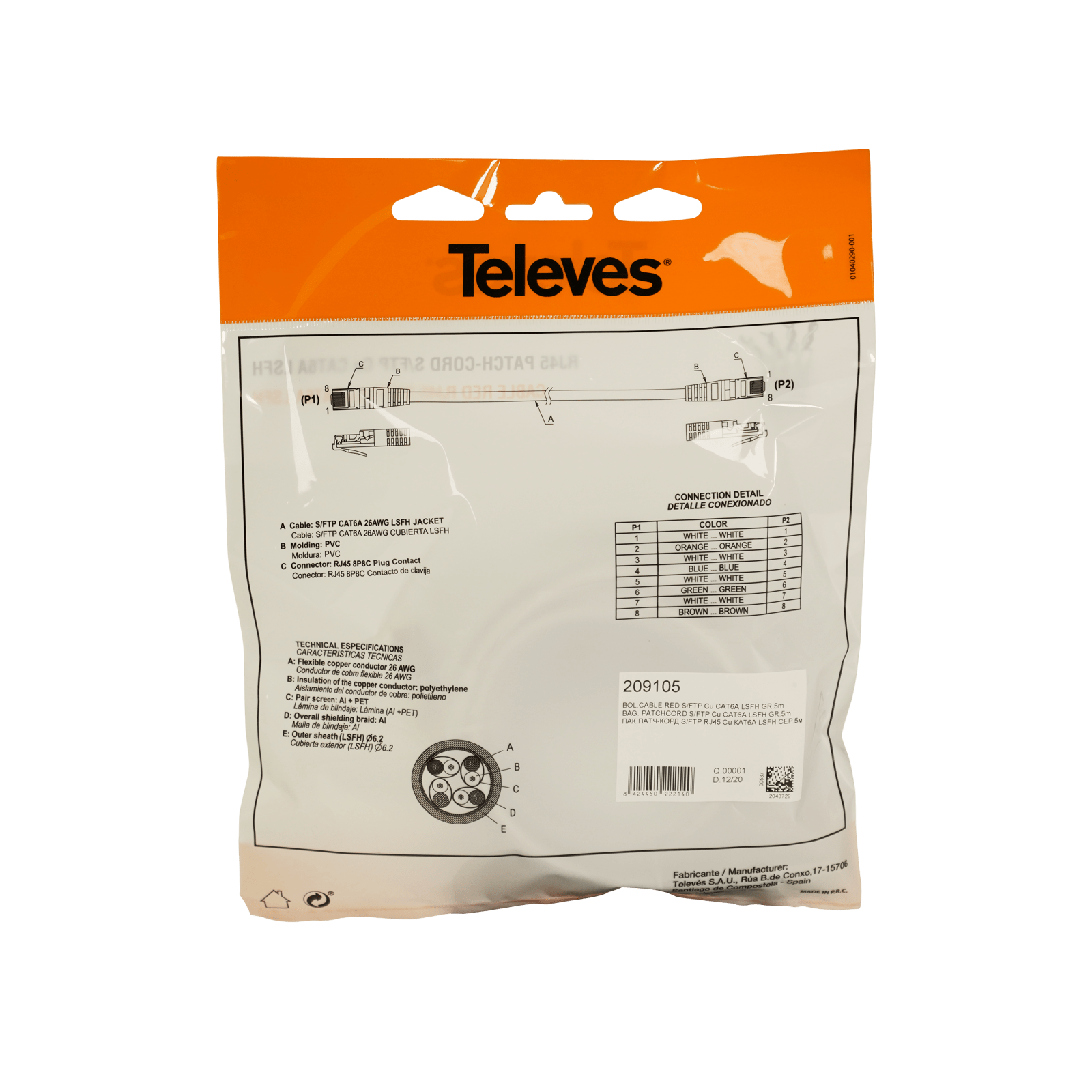 TELEVES - Cavo patch Ethernet Cat 6A S/FTP, 2m, grigio, LSFH, DIY-GRI. 209103
