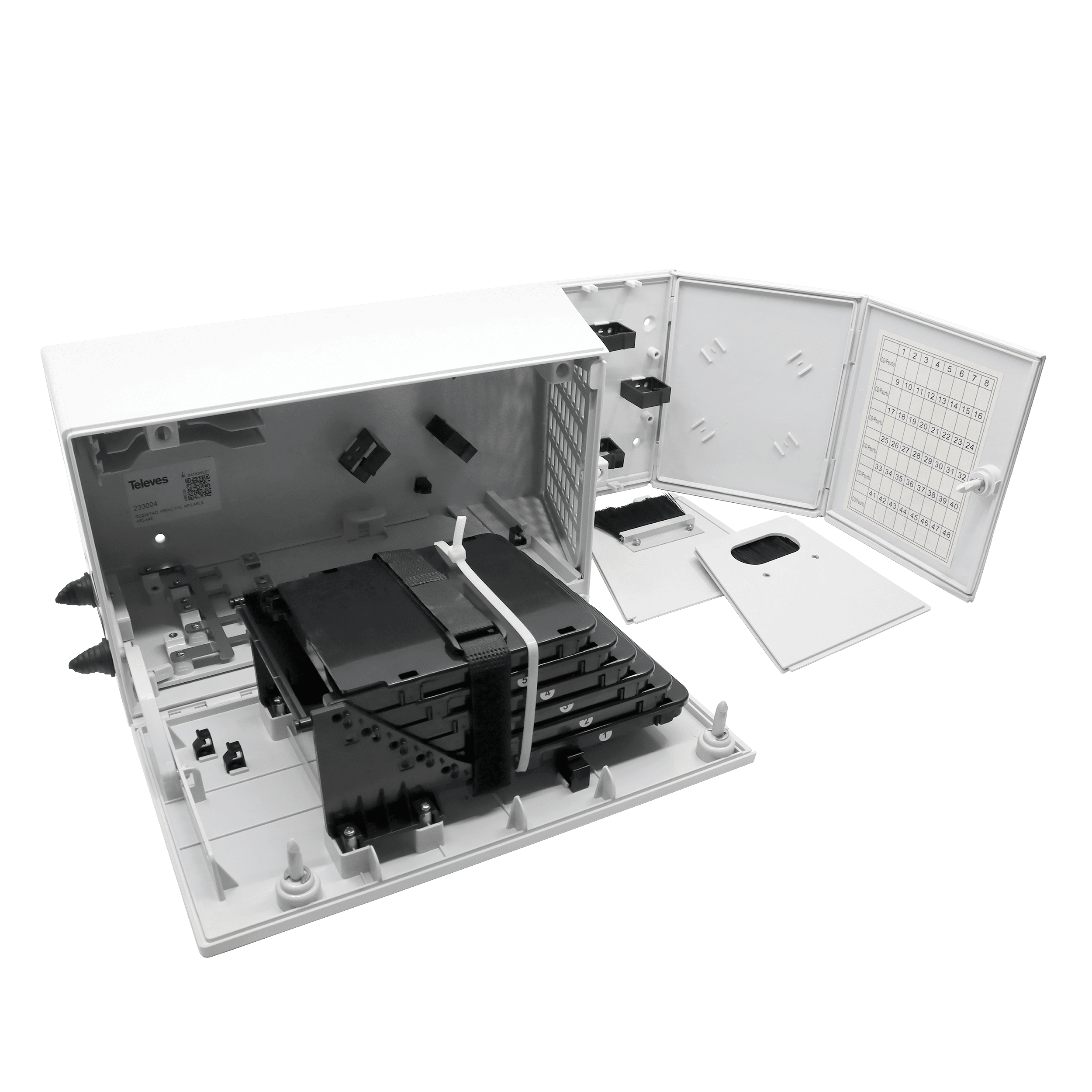Contenitore principale impilabile di fibra ottica (multioperatore) Fino a 48 adattatori femmina-femmina, ABS. Progettato per funzionare come punto di distribuzione per i cavi di fibra ottica. Il loro normale utilizzo è per i progetti FTTH o FTTR, facilitando la connessione tra la rete domestica e la rete dell'operatore (installazione nel CSOE). Consente d'installare diversi contenitori dello stesso tipo, mantenendo la possibilità di connessione tra loro. Il suo progetto impilabile verticalmente e con connessione diretta all'interno dei diversi armadi, offre flessibilità per ampliare i servizi in base alle necessità per ogni tipo d'installazione. Si divide in scompartimenti indipendenti con porta a serratura, separti da una pannello con capacità fino a 48 adattatori SC Simplex o LC Duplex. È realizzato in plastica ABS, che gli conferisce grande resistenza e leggerezza. Inoltre, include 6 vaschette per fibre impilabili, in grado di contenere fino a 8 giunzioni ciascuna; ciò offre un grande comfort quando si lavora all'interno del contenitore, in quanto le fibre sono organizzate e distanziate. . Materiale robusto grazie alla struttura in plastica ABS. Facilità per ampliare i servizi: Contenitore impilabile verticalmente con altri contenitori identici, formando così un contenitore di maggiore capacità. Gran comodità di lavoro, grazie alle vaschette installate sopra la porta sinistra che consente di lavorare le fibre sopra una superficie orizzontale. Incorpora 6 vaschette di F.O indipendenti e reclinabili (formato libro), con capacità per ospitare fino a 8 giunzioni ognuna. Incorpora 4 ancoraggi metallici per il fissaggio degli elementi centrali di resistenza, previsti per i cavi di F.O. Passacavi a spazzola antipolvere in alto e in basso, per il passaggio della fibra di interconnessione alle contenitore o per l'accesso dell'operatore (capacità fino a 59x28 mm). Dotato di 3 gomme per 4 accessi laterali di fibra. Etichetta adesiva sulla porta per identificare ogni connettore con la residenza appropriata. Dimensioni (L x A x P): 478mm x 180mm x 151mm. Colore grigio (RAL 7035).