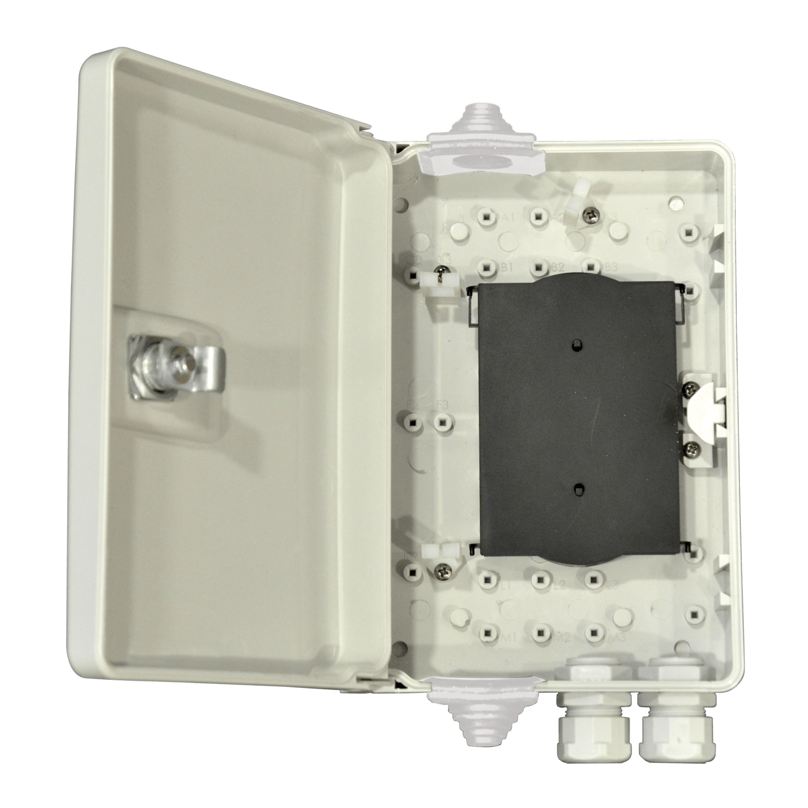 Contenitore secondario compatto di fibra ottica Fino per 12 o 16 fibre. Progettato per funzionare come elemento di passaggio e derivazione dei cavi di fibra ottica. Il loro normale utilizzo è per i progetti FTTH all'interno degli edifici (solitamente si installa nel contenitore secondario). Ha la capacità per alloggiare al suo interno fino a 12 fusioni grazie ai 2 scompartimenti, da 6 fusioni ciascuno, preinstallati nei vassoi. Inoltre, grazie ai 2 scompartimenti aggiuntivi , da 8 fusioni ciascuno, la capacità può essere aumentata a 16 fusioni installando al loro posto quelli standard. . Struttura in plastica. Ingresso/uscita del cavo multifibra della canalizzazione principale mediante canule progettate per alloggiare fibre di diversi diametri. Nella parte inferiore, dispone di 2 passacavi per l'uscita della fibre ottiche. Ogni passacavi può alloggiare 4 cavi di 2 fibre . Facilita l'installazione delle fusioni grazie ai 2 vaschette indipendenti e rimovibili che possono contenere fino a 8 fusioni ciascuno. Consente di aumentare il numero di fibre nell'installazione grazie ai 2 scompartimenti aggiuntivi da 8 fibre ciascuno. Impedisce le manomissioni esterne grazie alla serratura a chiave inclusa nello sportello. Protezione contro le particelle solide di diametro pari o superiore a 1 mm e la pioggia nebulizzata grazie al grado di tenuta IP43. Protezione dagli urti estremamente elevata grazie alla classificazione di resistenza agli urti IK10. Bulloni di ancoraggio a parete inclusa. Dimensioni (L x A x P): 163 mm x 265 mm x 69 mm. Colore grigio (RAL 7035).