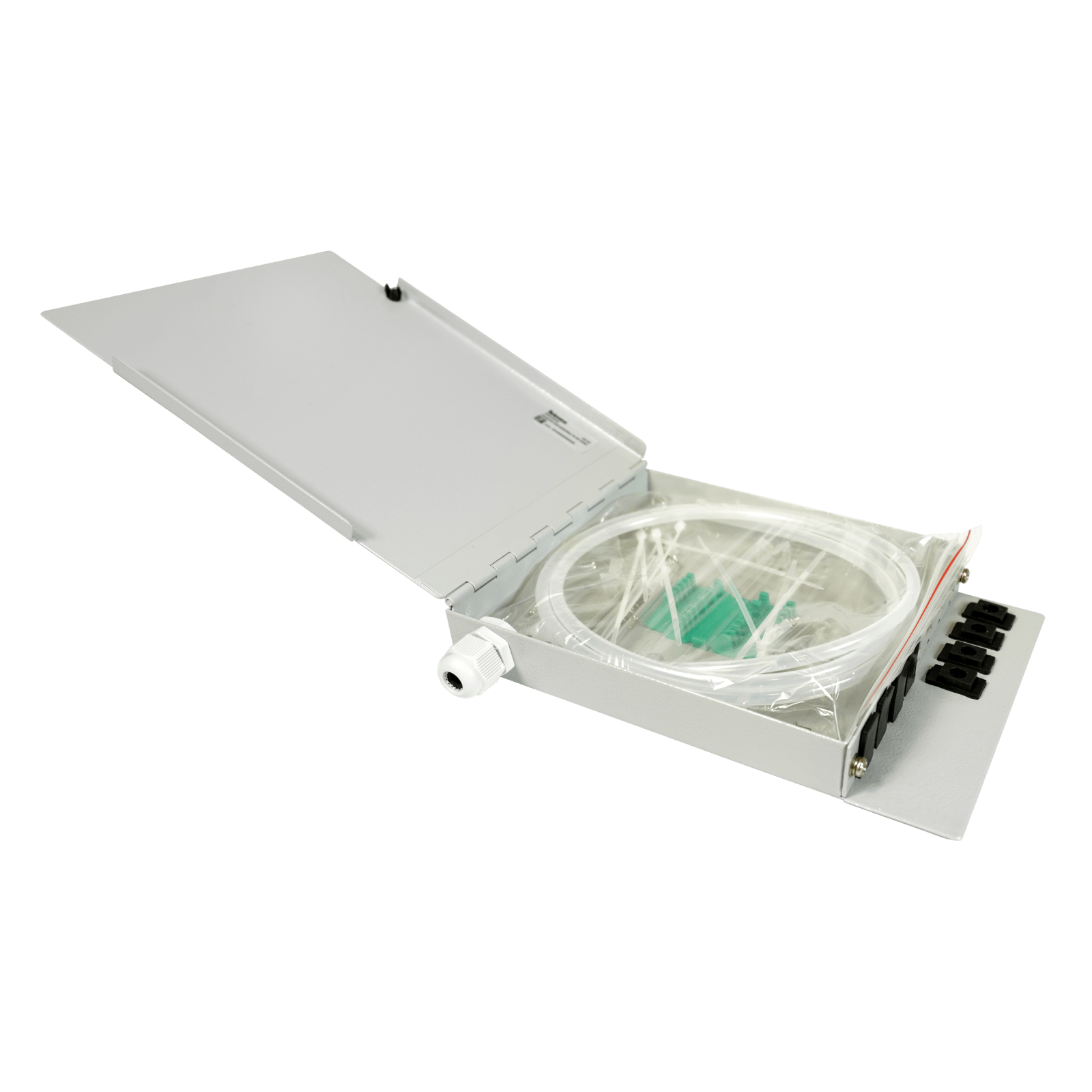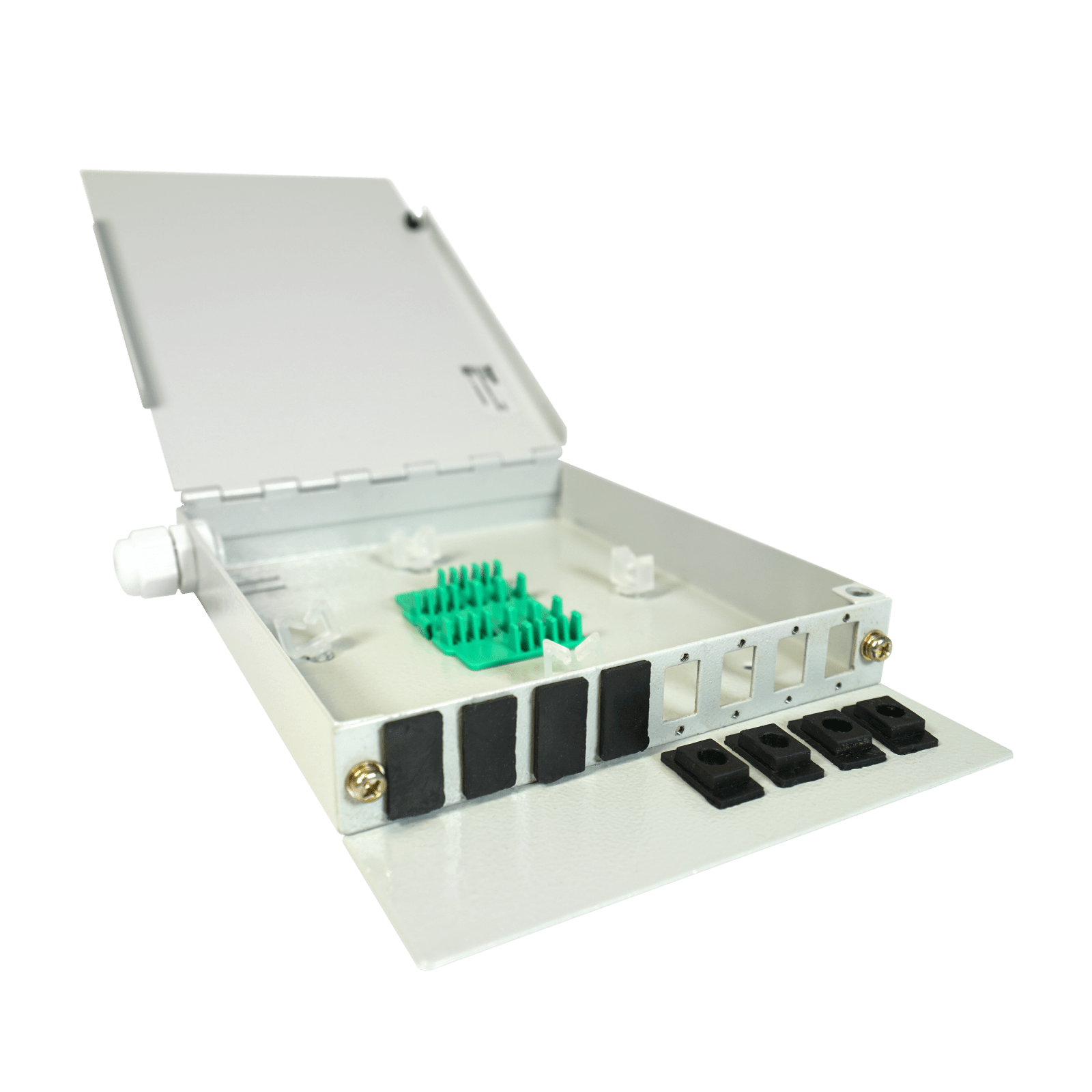 Contenitore secondario finale di fibra ottica Fino a 8 fibre. Progettato per funzionare come elemento finale di fibra ottica. Il loro normale utilizzo è per i progetti FTTH all'interno degli edifici (solitamente si installa nel contenitore secondario). Ha una capacità per alloggiare al suo interno fino a 8 giunzioni e 8 adattatori SC Simplex o LC Duplex. Include 8 tappi in gomma per le feritoie, impedendo l'ingresso di polvere o altri elementi quando i connettori non sono installati, mantenendo pulito l'interno del contenitore. . Materiale robusto grazie alla struttura in acciaio. Ingresso del cavo multifibra mediante passacavi PG9. Possibilità d'installazione senza connettori: Perforando i tappi per il passaggio della fibra, mantenendo la fessura sigillata. Incorpora un sopporto che consente di alloggiare fino a 8 giunzioni. Comprensivo di 8 guaine protettive termoretraibili per le fusioni e 8 flange di fissaggio per la corretta disposizione all'interno del registro. La manomissione esterna è resa più difficile dalla chiusura a vite della porta (azionabile manualmente). Bulloni di ancoraggio a parete inclusa. Dimensioni (L x A x P): 210mm x 170mm x 38mm . Colore grigio (RAL 7035).
