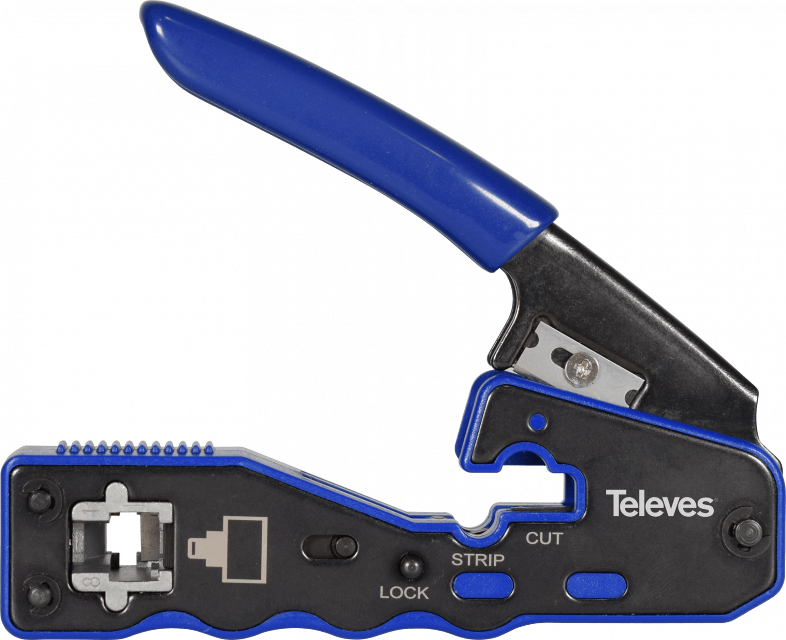 TELEVES - Crimpatrice con taglio automatico per connettori RJ45 maschio passanti e non passanti.