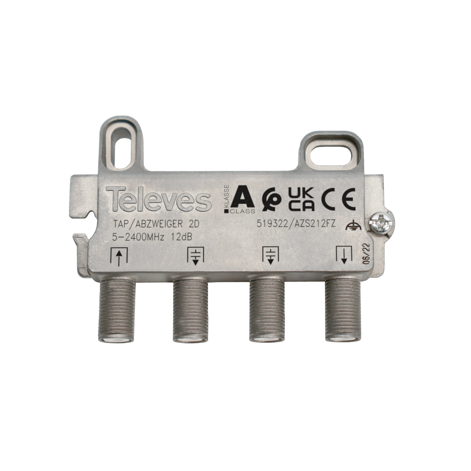 Derivatore F 2D 5...2400MHz 12dB. Derivatore da 2 derivazioni con connettori F, per segnali SMATV. Le sue perdite di derivazione (12dB) lo rendono consigliato per l'installazione negle impianto 1.Presenta un comportamento elettrico efficiente grazie al suo design compatto. Inoltre, il suo telaio offre un'ottima schermatura poiché è realizzato in Zamak.Derivatore per installazione da interno, montaggio a parete, su piastra rack o su guida DIN standard. Fornito in scatole da 10pz. . Flessibilità di montaggio: può essere installato tramite viti a parete, su piastre rack con dadi sui relativi connettori, o su guida DIN standard (con adattatore art. 519901). Facilità di inserimento del cavo, grazie all'angolo di inclinazione di 10º dei connettori F rispetto alla parete di installazione. Ottimizzazione dello spazio nelle cassette di derivazione e negli armadi: i suoi connettori si trovano sempre sullo stesso lato. Migliore organizzazione dell'impianto: permette il passaggio dei cavi attraverso la sua parte posteriore. Tutti i partitori di questa gamma possono essere fissati tramite vite, richiedendo un unico cavo di messa a terra. Mantiene i livelli alla presa, anche con cavi lunghi, grazie a una migliore planarità nella risposta al passaggio. Elevata affidabilità: produzione in linee robotizzate con microchip all'avanguardia. Design, qualità e produzione 100% europei. Basse perdite di passaggio. Ottima schermatura (classe A), fabbricato in Zamak. Connettori F con sezione filettata maggiorata, per facilitare e rendere sicura la loro installazione su piastra rack. Montaggio da interno. Include vite per la messa a terra. Passaggio DC bidirezionale tra ingresso e uscita.
