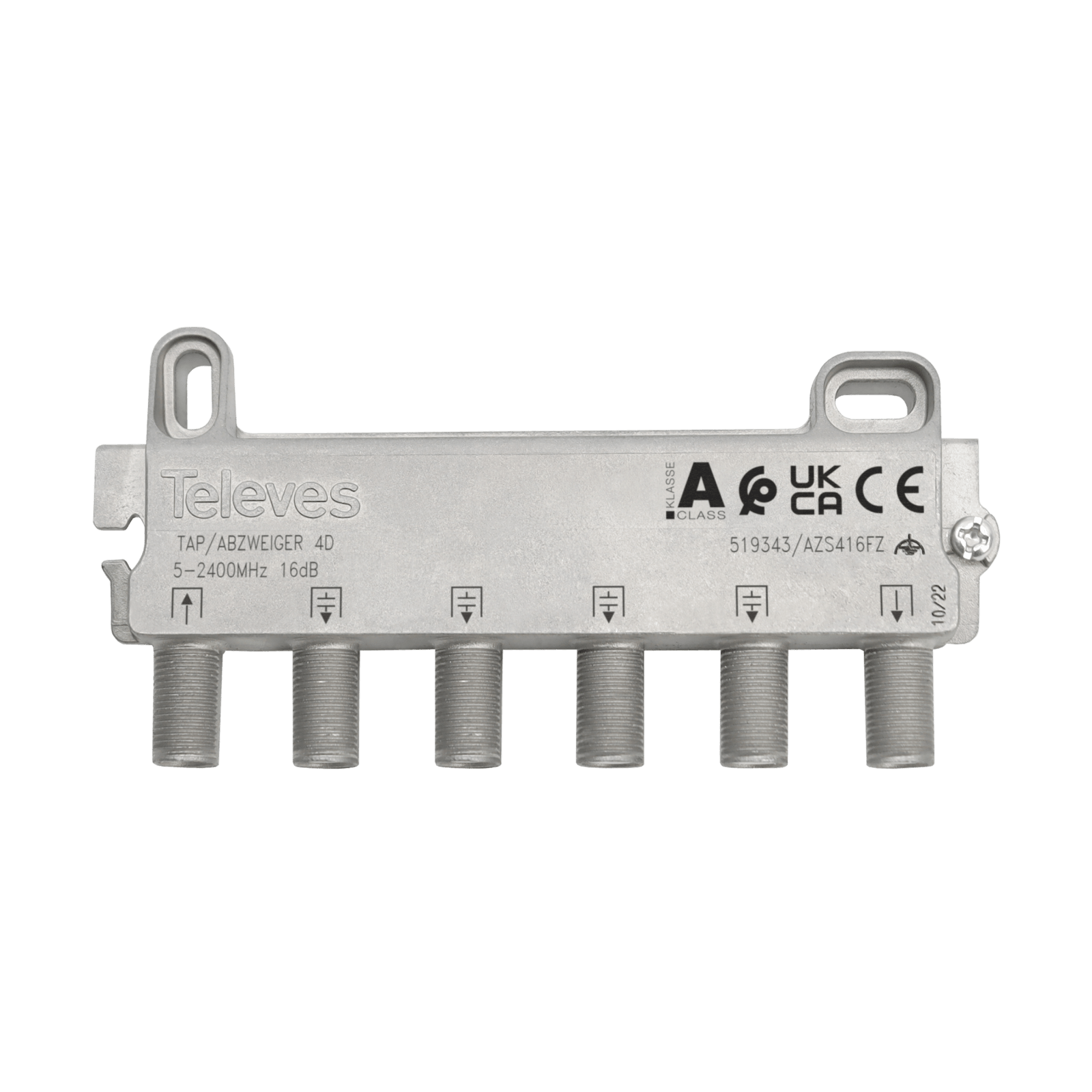 Derivatore F 4D 5...2400MHz 16dB. Derivatore da 4 derivazioni con connettori F, per segnali SMATV. Le sue perdite di derivazione (16dB) lo rendono consigliato per l'installazione nel impianto 3.Presenta un comportamento elettrico efficiente grazie al suo design compatto. Inoltre, il suo telaio offre un'ottima schermatura poiché è realizzato in Zamak.Derivatore per installazione da interno, montaggio a parete, su piastra rack o su guida DIN standard. Fornito in scatole da 10pz. . Flessibilità di montaggio: può essere installato tramite viti a parete, su piastre rack con dadi sui relativi connettori, o su guida DIN standard (con adattatore art. 519901). Facilità di inserimento del cavo, grazie all'angolo di inclinazione di 10º dei connettori F rispetto alla parete di installazione. Ottimizzazione dello spazio nelle cassette di derivazione e negli armadi: i suoi connettori si trovano sempre sullo stesso lato. Migliore organizzazione dell'impianto: permette il passaggio dei cavi attraverso la sua parte posteriore. Tutti i partitori di questa gamma possono essere fissati tramite vite, richiedendo un unico cavo di messa a terra. Mantiene i livelli alla presa, anche con cavi lunghi, grazie a una migliore planarità nella risposta al passaggio. Elevata affidabilità: produzione in linee robotizzate con microchip all'avanguardia. Basse perdite di passaggio. Ottima schermatura (classe A), fabbricato in Zamak. Connettori F con sezione filettata maggiorata, per facilitare e rendere sicura la loro installazione su piastra rack. Montaggio da interno. Include vite per la messa a terra. Passaggio DC bidirezionale tra ingresso e uscita. Design, qualità e produzione 100% europei.