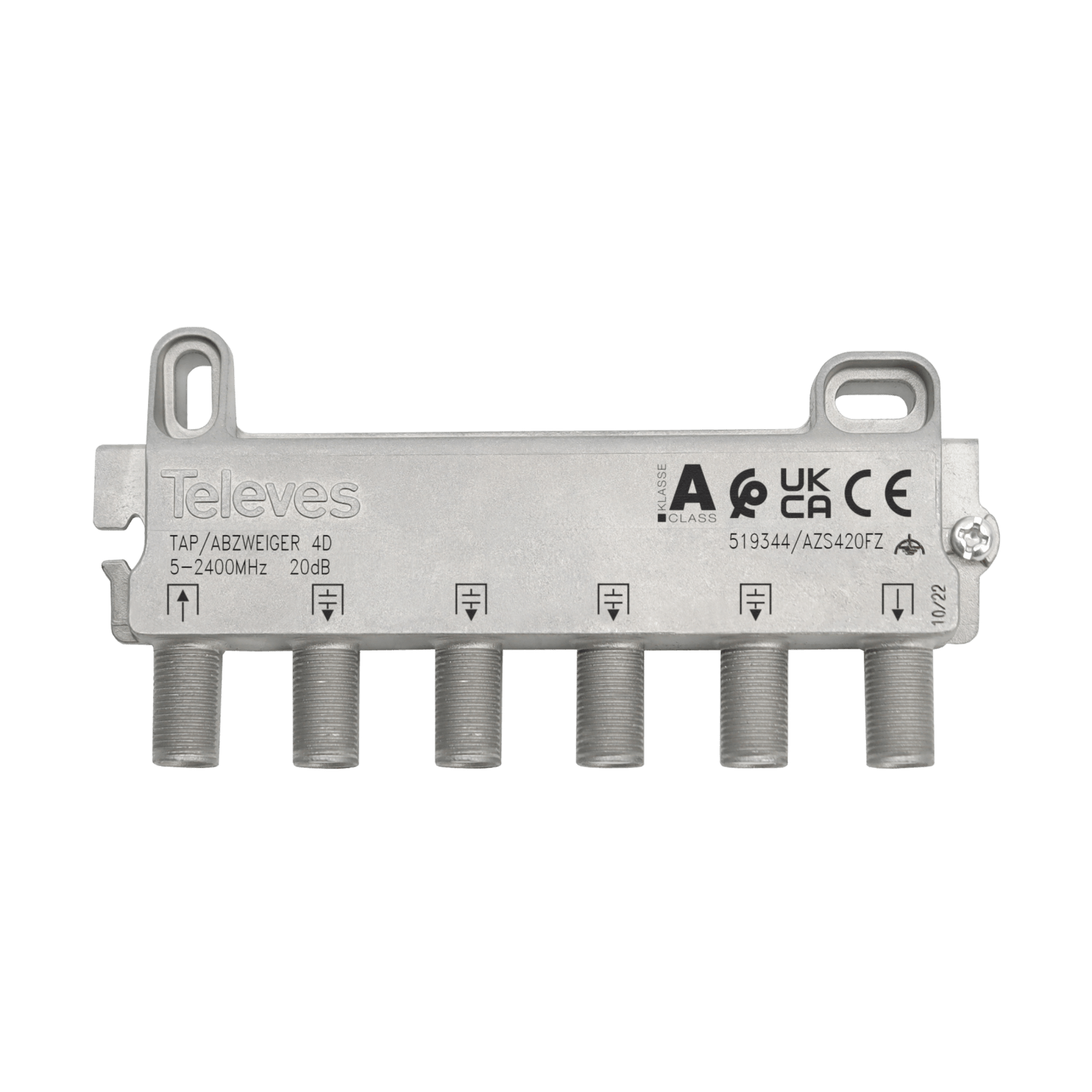 Derivatore F 4D 5...2400MHz 20dB. Derivatore da 4 derivazioni con connettori F, per segnali SMATV. Le sue perdite di derivazione (20dB) lo rendono consigliato per l'installazione negli impianti 4 e 5.Presenta un comportamento elettrico efficiente grazie al suo design compatto. Inoltre, il suo telaio offre un'ottima schermatura poiché è realizzato in Zamak.Derivatore per installazione da interno, montaggio a parete, su piastra rack o su guida DIN standard. Fornito in scatole da 10pz. . Flessibilità di montaggio: può essere installato tramite viti a parete, su piastre rack con dadi sui relativi connettori, o su guida DIN standard (con adattatore art. 519901). Facilità di inserimento del cavo, grazie all'angolo di inclinazione di 10º dei connettori F rispetto alla parete di installazione. Ottimizzazione dello spazio nelle cassette di derivazione e negli armadi: i suoi connettori si trovano sempre sullo stesso lato. Migliore organizzazione dell'impianto: permette il passaggio dei cavi attraverso la sua parte posteriore. Tutti i partitori di questa gamma possono essere fissati tramite vite, richiedendo un unico cavo di messa a terra. Mantiene i livelli alla presa, anche con cavi lunghi, grazie a una migliore planarità nella risposta al passaggio. Elevata affidabilità: produzione in linee robotizzate con microchip all'avanguardia. Design, qualità e produzione 100% europei. Basse perdite di passaggio. Ottima schermatura (classe A), fabbricato in Zamak. Connettori F con sezione filettata maggiorata, per facilitare e rendere sicura la loro installazione su piastra rack. Montaggio da interno. Include vite per la messa a terra. Passaggio DC bidirezionale tra ingresso e uscita.