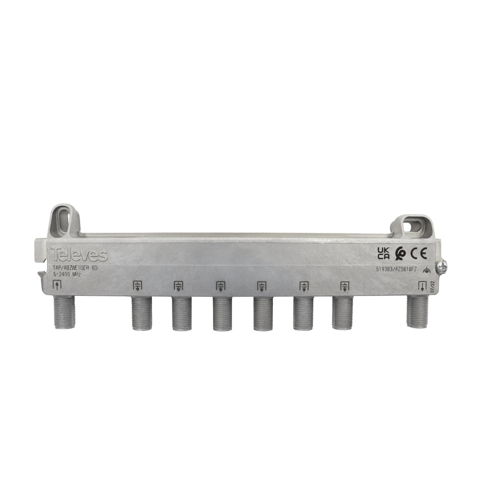 Derivatore F 6D 5...2400MHz 16dB. Derivatore da 6 derivazioni con connettori F, per segnali SMATV. Le sue perdite di derivazione (16dB) lo rendono consigliato per l'installazione nel impianto 2.Presenta un comportamento elettrico efficiente grazie al suo design compatto. Inoltre, il suo telaio offre un'ottima schermatura poiché è realizzato in Zamak.Derivatore per installazione da interno, montaggio a parete, su piastra rack o su guida DIN standard. Fornito in scatole da 10pz. . Flessibilità di montaggio: può essere installato tramite viti a parete, su piastre rack con dadi sui relativi connettori, o su guida DIN standard (con adattatore art. 519901). Facilità di inserimento del cavo, grazie all'angolo di inclinazione di 10º dei connettori F rispetto alla parete di installazione. Ottimizzazione dello spazio nelle cassette di derivazione e negli armadi: i suoi connettori si trovano sempre sullo stesso lato. Migliore organizzazione dell'impianto: permette il passaggio dei cavi attraverso la sua parte posteriore. Tutti i partitori di questa gamma possono essere fissati tramite vite, richiedendo un unico cavo di messa a terra. Mantiene i livelli alla presa, anche con cavi lunghi, grazie a una migliore planarità nella risposta al passaggio. Elevata affidabilità: produzione in linee robotizzate con microchip all'avanguardia. Basse perdite di passaggio. Ottima schermatura (classe A), fabbricato in Zamak. Connettori F con sezione filettata maggiorata, per facilitare e rendere sicura la loro installazione su piastra rack. Montaggio da interno. Include vite per la messa a terra. Passaggio DC bidirezionale tra ingresso e uscita. Design, qualità e produzione 100% europei.