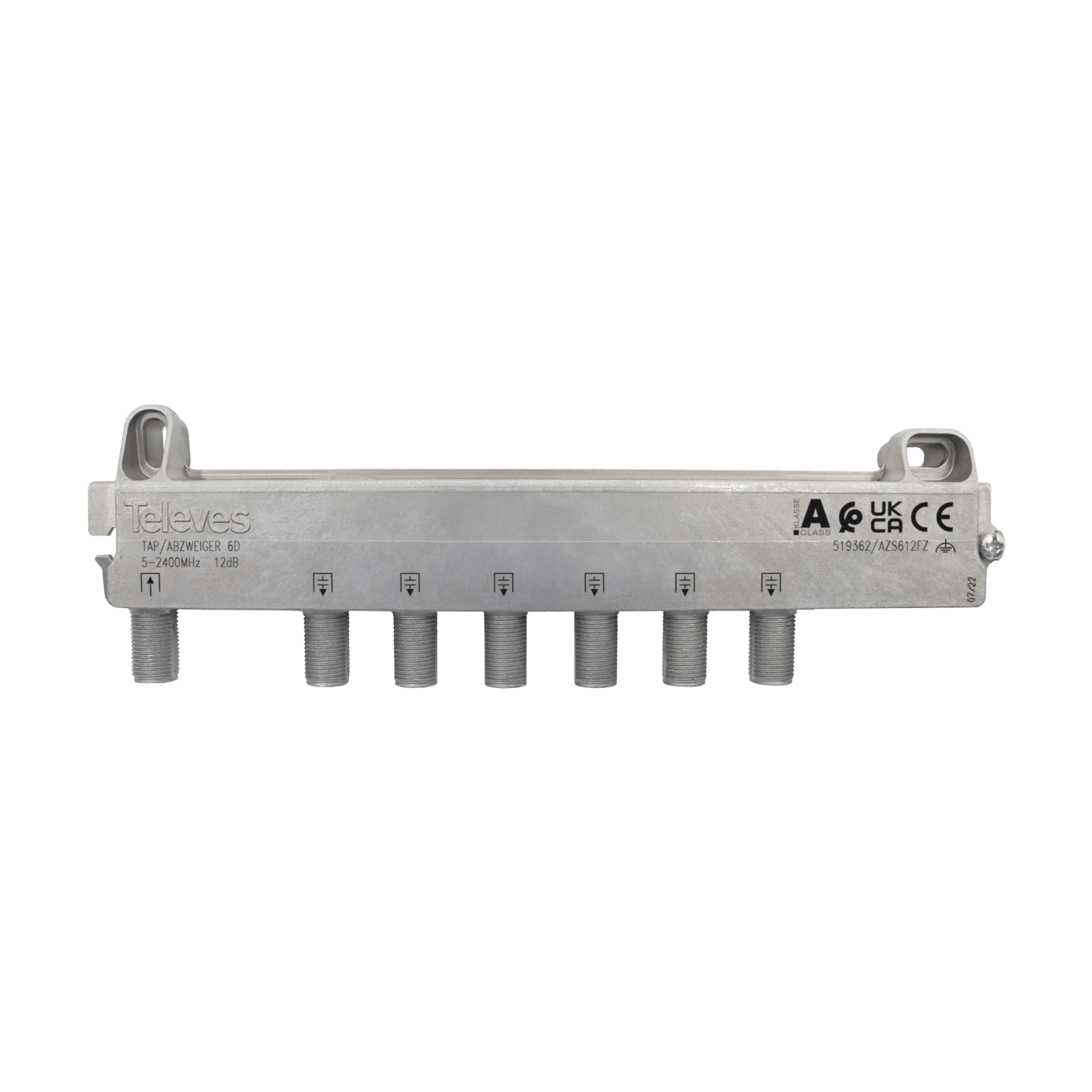 Derivatore terminale F 6D 5...2400MHz 12dB. Derivatore da 6 derivazioni con connettori F, per segnali SMATV. Le sue perdite di derivazione (12dB) e la mancanza di uscita passante, lo rendono consigliato per l'installazione negle impianto 1.Presenta un comportamento elettrico efficiente grazie al suo design compatto. Inoltre, il suo telaio offre un'ottima schermatura poiché è realizzato in Zamak.Derivatore per installazione da interno, montaggio a parete, su piastra rack o su guida DIN standard. Fornito in scatole da 10pz. . Flessibilità di montaggio: può essere installato tramite viti a parete, su piastre rack con dadi sui relativi connettori, o su guida DIN standard (con adattatore art. 519901). Facilità di inserimento del cavo, grazie all'angolo di inclinazione di 10º dei connettori F rispetto alla parete di installazione. Ottimizzazione dello spazio nelle cassette di derivazione e negli armadi: i suoi connettori si trovano sempre sullo stesso lato. Migliore organizzazione dell'impianto: permette il passaggio dei cavi attraverso la sua parte posteriore. Tutti i partitori di questa gamma possono essere fissati tramite vite, richiedendo un unico cavo di messa a terra. Mantiene i livelli alla presa, anche con cavi lunghi, grazie a una migliore planarità nella risposta. Basse perdite di passaggio. Ottima schermatura (classe A), fabbricato in Zamak. Connettori F con sezione filettata maggiorata, per facilitare e rendere sicura la loro installazione su piastra rack. Montaggio da interno. Include vite per la messa a terra. Passaggio DC bidirezionale tra ingresso e uscita. Elevata affidabilità: produzione in linee robotizzate con microchip all'avanguardia. Design, qualità e produzione 100% europei.