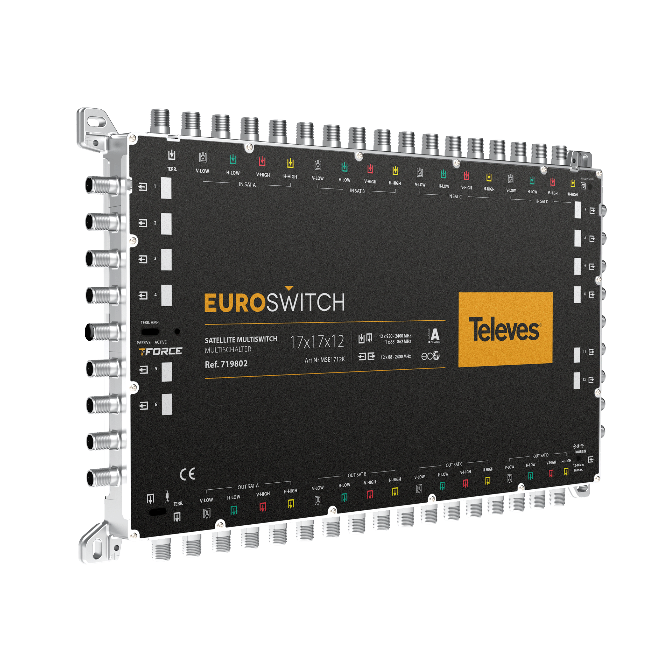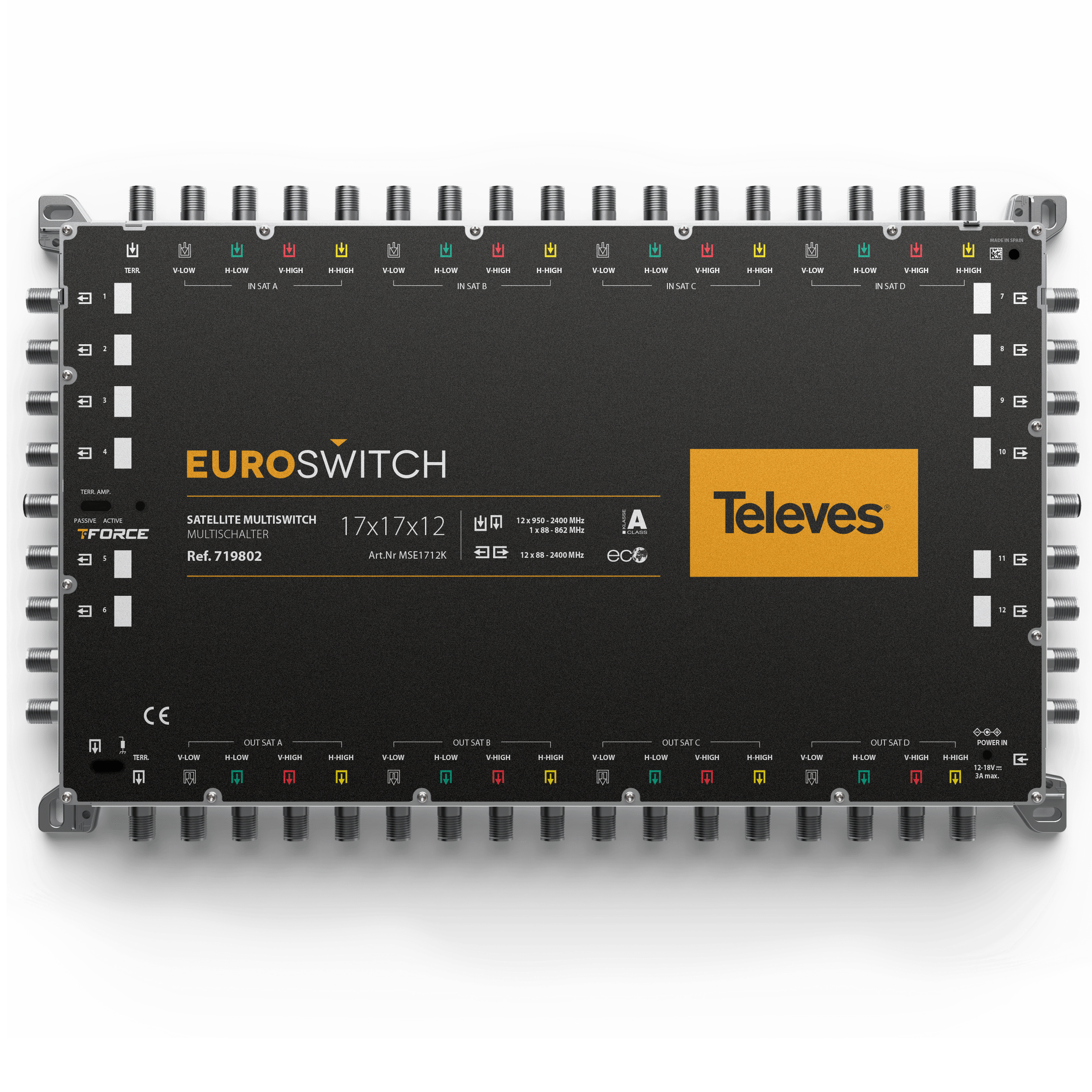 EuroSwitch 17 ingressi - 12 uscite . Multiswitch compatto dotato di 17 ingressi (uno terrestre e 16 per quattro satelliti, ciascuno con le sue quattro polarità) e 12 uscite utente. Grazie alla sua grande compatibilità e al suo ottimizzato design elettronico, presenta perdite passanti e alla presa molto basse. Ciò consente di ridurre il numero di amplificatori necessari nella cascata e di ottenere un segnale meglio bilanciato per gli utenti, anche in grandi impianti condominiali.Può essere utilizzato come terminale (tipologia a stella) o come cascata, utilizzando un semplice interruttore. Inoltre, incorpora un secondo interruttore che attiva la tecnologia TForce, che regola automaticamente il segnale terrestre e lo mantiene costante nonostante le variazioni nella ricezione.RED compliant . Molto compatto per dimensioni e peso, anche nei modelli con numero elevato di derivate utente. Perdite di passaggio e alla presa molto basse. Alta schermatura (classe A). Realizzato in zamak. Versatile: selettore per passare dalla modalità cascata a quella terminale. Ottimo isolamento tra ingressi e uscite. Dotato della tecnologia TForce, il livello di uscita terrestre viene automaticamente regolato (TERR. AMP. ACTIVE) al livello ottimale. Due opzioni di alimentazione: dall'alimentatore o dalla cascata attraverso gli ingressi o le uscite del satellite. Basso consumo in condizioni normali. Inoltre, la modalità ECO riduce i consumi al diminuire del numero di utenti connessi. Ampia gamma di alimentatori da 12-18 V, che lo rende compatibile con la maggior parte dei sistemi esistenti. Passaggio di corrente su tutti gli ingressi e i passanti. Identificazione del colore in ingresso e in uscita. 100% design, qualità e produzione europea.