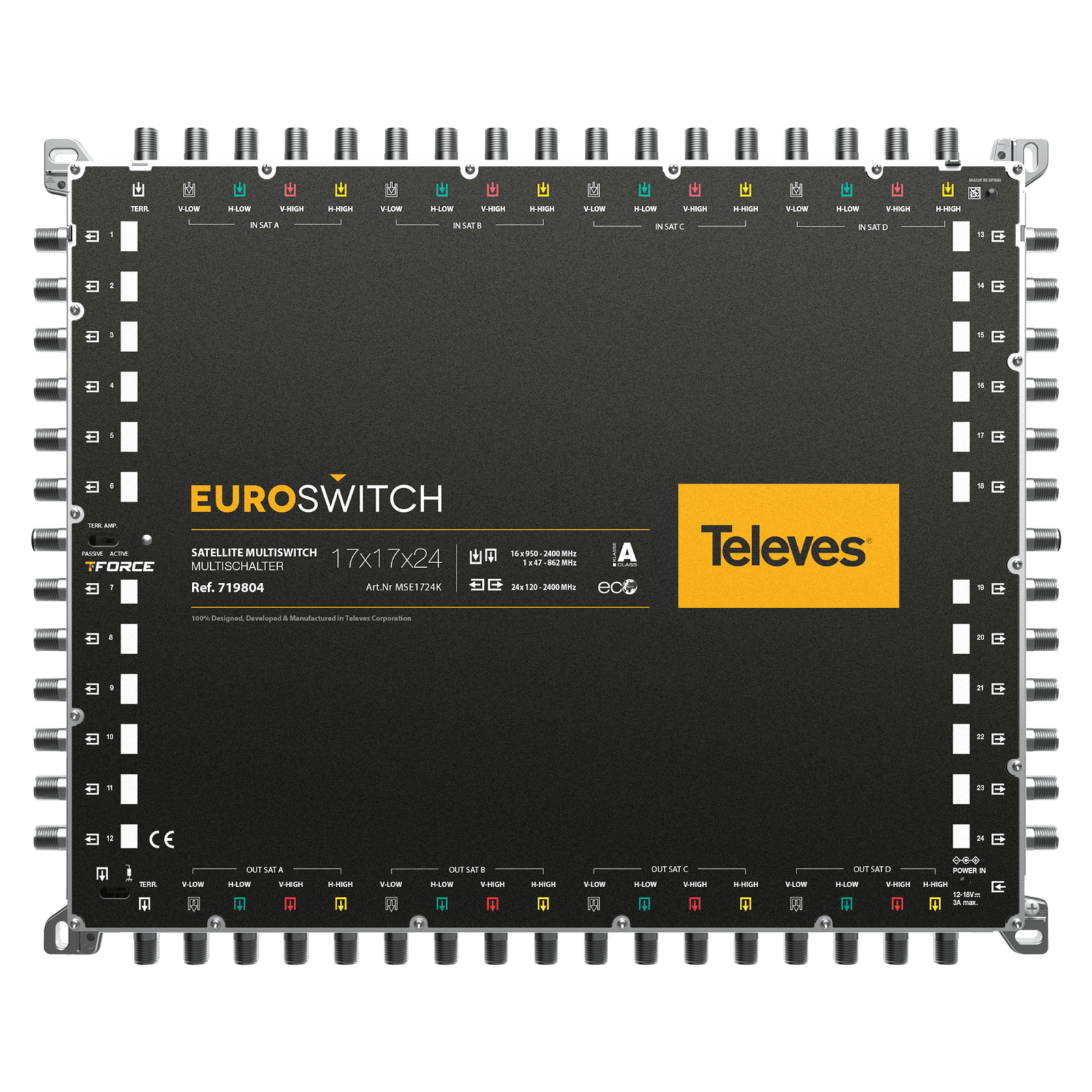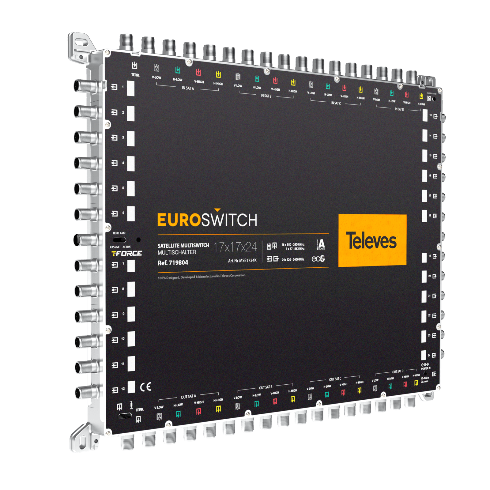 EuroSwitch 17 ingressi - 24 uscite . Multiswitch compatto dotato di 17 ingressi (uno terrestre e 16 per quattro satelliti, ciascuno con le sue quattro polarità) e 24 uscite utente. Grazie alla sua grande compatibilità e al suo ottimizzato design elettronico, presenta perdite passanti e alla presa molto basse. Ciò consente di ridurre il numero di amplificatori necessari nella cascata e di ottenere un segnale meglio bilanciato per gli utenti, anche in grandi impianti condominiali.Può essere utilizzato come terminale (tipologia a stella) o come cascata, utilizzando un semplice interruttore. Inoltre, incorpora un secondo interruttore che attiva la tecnologia TForce, che regola automaticamente il segnale terrestre e lo mantiene costante nonostante le variazioni nella ricezione.RED compliant . Molto compatto per dimensioni e peso, anche nei modelli con numero elevato di derivate utente. Perdite di passaggio e alla presa molto basse. Alta schermatura (classe A). Realizzato in zamak. Versatile: selettore per passare dalla modalità cascata a quella terminale. Ottimo isolamento tra ingressi e uscite. Dotato della tecnologia TForce, il livello di uscita terrestre viene automaticamente regolato (TERR. AMP. ACTIVE) al livello ottimale. Due opzioni di alimentazione: dall'alimentatore o dalla cascata attraverso gli ingressi o le uscite del satellite.. Basso consumo in condizioni normali. Inoltre, la modalità ECO riduce i consumi al diminuire del numero di utenti connessi.. Ampia gamma di alimentatori da 12-18 V, che lo rende compatibile con la maggior parte dei sistemi esistenti. Passaggio di corrente su tutti gli ingressi e i passanti. Identificazione del colore in ingresso e in uscita. 100% design, qualità e produzione europea.