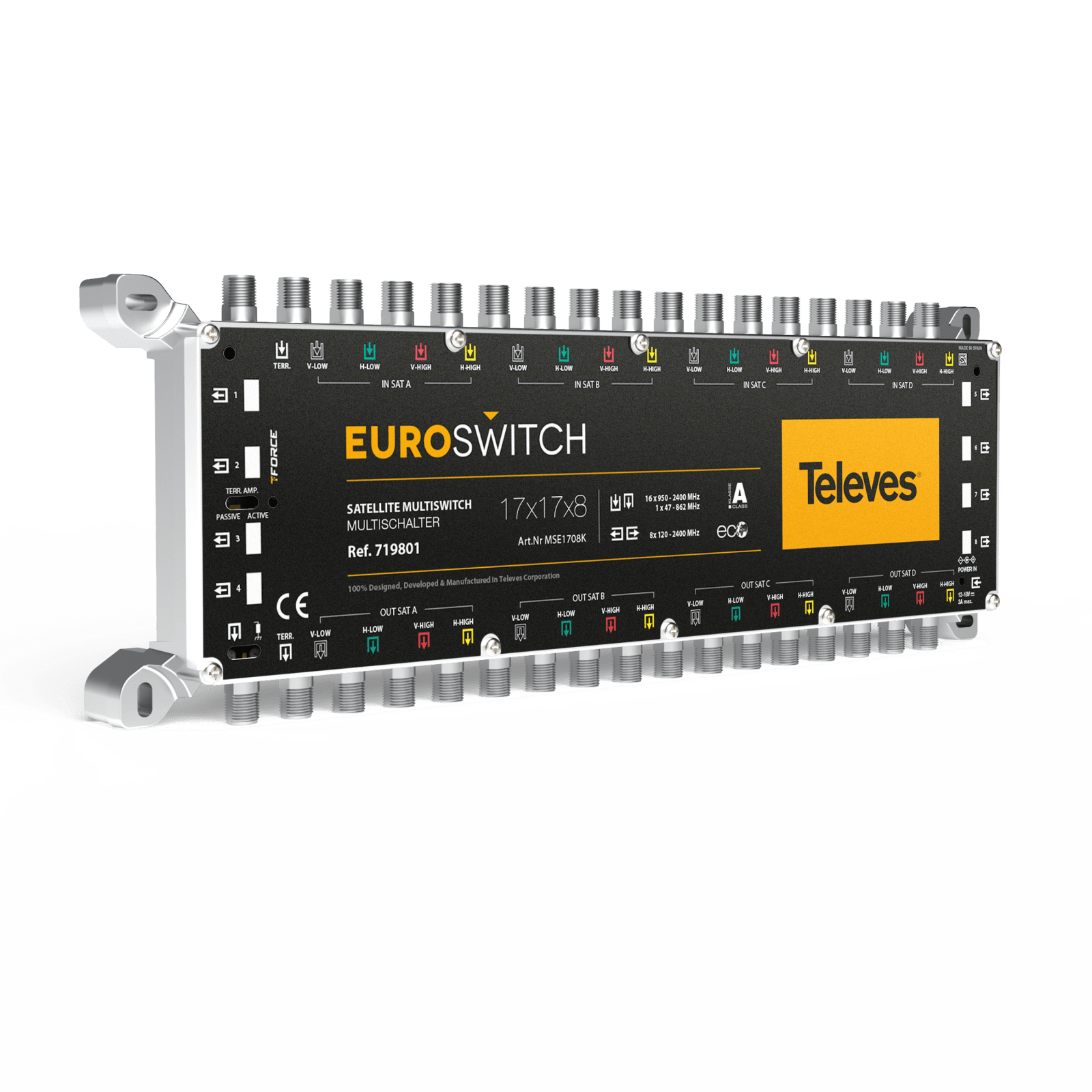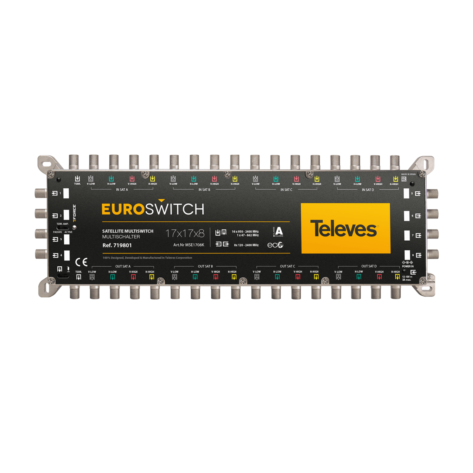 EuroSwitch 17 ingressi - 8 uscite . Multiswitch compatto dotato di 17 ingressi (uno terrestre e 16 per quattro satelliti, ciascuno con le sue quattro polarità) e 8 uscite utente. Grazie alla sua grande compattezza e al suo ottimizzato design elettronico, presenta perdite passanti e alla presa molto basse. Ciò consente di ridurre il numero di amplificatori necessari nella cascata e di ottenere un segnale meglio bilanciato per gli utenti, anche in grandi impianti condominiali.Può essere utilizzato come terminale (tipologia a stella) o come cascata, utilizzando un semplice interruttore. Inoltre, incorpora un secondo interruttore che attiva la tecnologia TForce, che regola automaticamente il segnale terrestre e lo mantiene costante nonostante le variazioni nella ricezione.RED compliant . Molto compatto per dimensioni e peso, anche nei modelli con numero elevato di derivate utente. Perdite di passaggio e alla presa molto basse. Alta schermatura (classe A). Realizzato in zamak. Versatile: selettore per passare dalla modalità cascata a quella terminale. Ottimo isolamento tra ingressi e uscite. Dotato della tecnologia TForce, il livello di uscita terrestre viene automaticamente regolato (TERR. AMP. ACTIVE) al livello ottimale. Due opzioni di alimentazione: dall'alimentatore o dalla cascata attraverso gli ingressi o le uscite del satellite.. Basso consumo in condizioni normali. Inoltre, la modalità ECO riduce i consumi al diminuire del numero di utenti connessi.. Ampia gamma di alimentatori da 12-18 V, che lo rende compatibile con la maggior parte dei sistemi esistenti. Passaggio di corrente su tutti gli ingressi e i passanti. Identificazione del colore in ingresso e in uscita. 100% design, qualità e produzione europea.