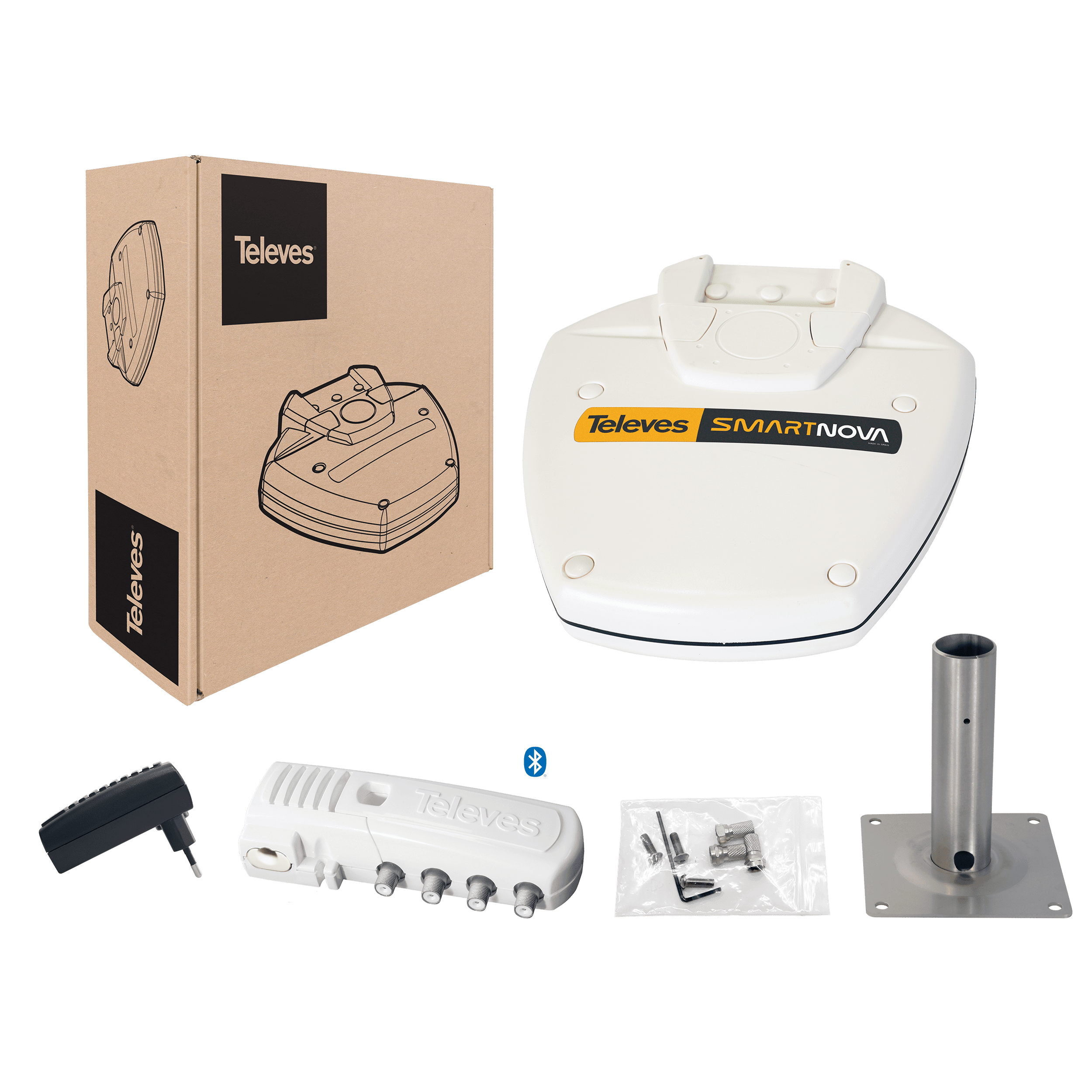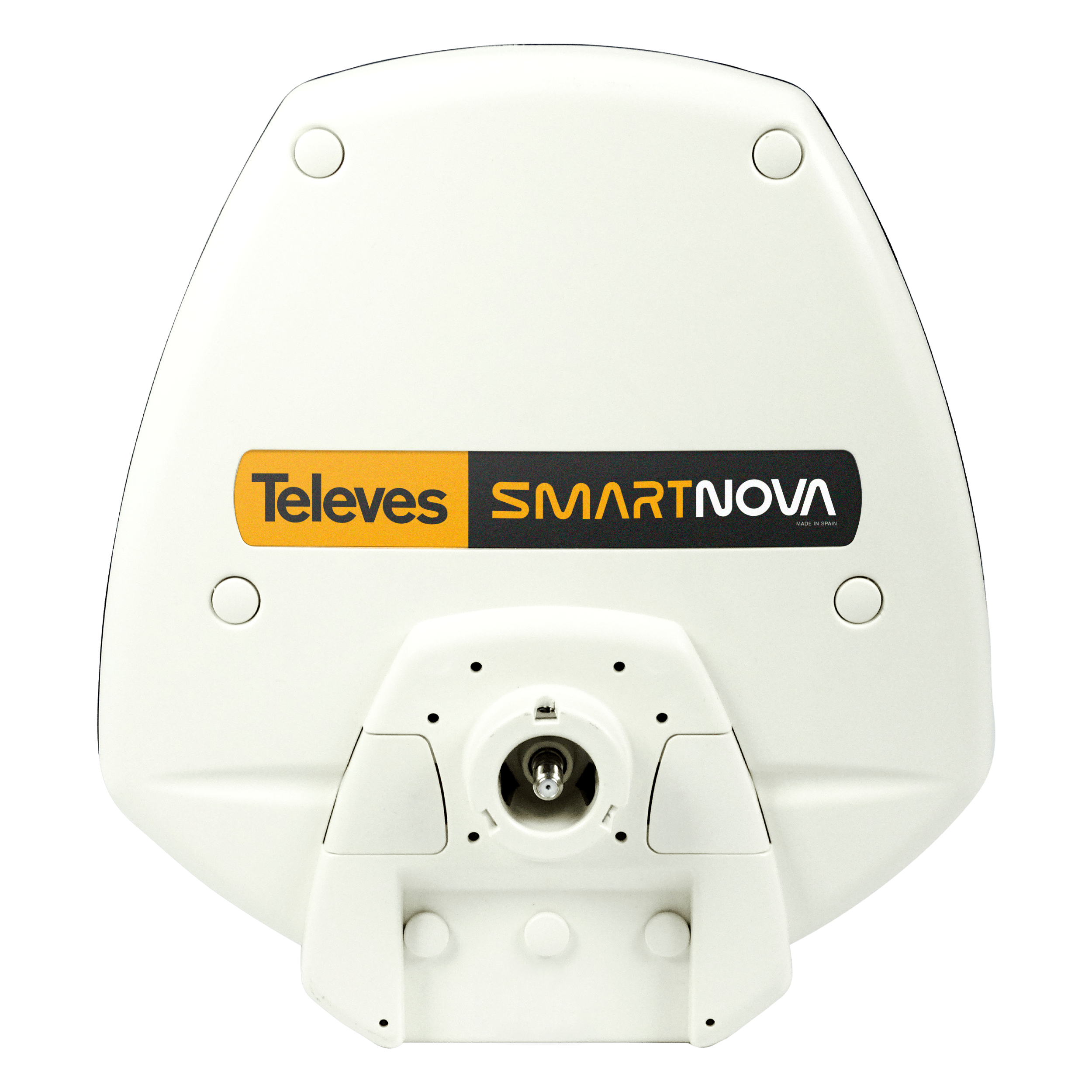 Antenna SMARTNOVA UHF (LTE700, 2º Dividendo Digitale), ricezione a 360º per camper o imbarcazioni. SmartNova è un'antenna intelligente, automatica e omnidirezionale, progettata per captare il segnale del digitale terrestre (TDT) in soggiorni di breve durata (roulotte, imbarcazioni...) dove la rapidità e la facilità di installazione sono fondamentali. Questa antenna è composta internamente da 3 sotto-antenne direttive disposte a 120º, permettendo così una copertura totale dell'orizzonte (360º), ottenendo allo stesso tempo un guadagno di ricezione molto superiore rispetto ad altre antenne omnidirezionali. SmartNova garantisce in ogni momento la migliore qualità del segnale. La sua intelligenza filtra e processa ogni canale del digitale terrestre (TDT) individualmente, regola il guadagno al livello ottimale ed equilibra il segnale TV con un'elevata selettività tra i canali adiacenti. La ricezione rimane sempre stabile, poiché l'antenna varia intelligentemente il guadagno per compensare eventuali variazioni temporanee del livello del segnale ricevuto (condizioni meteorologiche, ostacoli, ecc.). L'installazione è molto rapida e semplice, poiché l'antenna non necessita di essere orientata, e una volta collegata si autoconfigura automaticamente. Inoltre, l'alimentatore può essere collegato sia alla corrente elettrica alternata del campeggio, sia direttamente alla batteria del veicolo. In questo modo, l'antenna avrà sempre una fonte di alimentazione, indipendentemente dal luogo di permanenza. Infine, l'utente dispone di ASuite, un'app mobile con cui può controllare in ogni momento lo stato dell'antenna. Viene fornita con un kit per l'installazione: Alimentatore antenna 9,5V, con connettore Jack. Alimentatore 12V per corrente alternata (220-230V~). Supporto dritto per l'installazione dell'antenna. 3 connettori F (rif. 4171xx). 3 viti e chiave a brugola da 3 mm. RED compliant . Ricezione omnidirezionale a 360º: formata da 3 sub-antenne disposte a 120°, riceve da tutte le direzioni senza necessità di orientamento. Moltiplica x2 il livello di uscita: l'uso di diverse subantenne direttive fornisce un guadagno d'antenna più elevato, raddoppiando facilmente il livello del segnale in uscita rispetto ad altre antenne omnidirezionali presenti sul mercato. Ricezione più stabile: il suo sistema di guadagno intelligente è in grado di sopportare variazioni o dissolvenza del segnale (fading) senza compromettere l'installazione del televisore. Alta selettività: i suoi 32 filtri bilanciano i canali senza problemi, raggiungendo fino a 28 dB di selettività tra canali adiacenti. Configurazione automatica in pochi secondi: l'utente può lanciare l'opzione “Autoprogrammazione'' dal proprio smartphone, con l'app ASuite e il Bluetooth®. L'antenna programmerà e regolerà tutti i canali in modo equilibrato. Risparmio della batteria: è possibile spegnere l’alimentazione della batteria tramite la app ASuite, eliminando il consumo di energia quando non è in uso. L’antenna mantiene la sua configurazione una volta riaccesa senza bisogno di configurarla nuovamente. Protezione contro il 4G/5G: il suo filtro anti-LTE respinge le interferenze telefoniche dal canale 48 in poi. Alimentazione flessibile: l'alimentatore con connettore jack può essere collegato a una rete elettrica convenzionale o alla batteria del veicolo. Design robusto e discreto: il suo radome a basso impatto visivo è completamente impermeabile e resistente alle intemperie (IP53), evitando il degrado nel tempo.