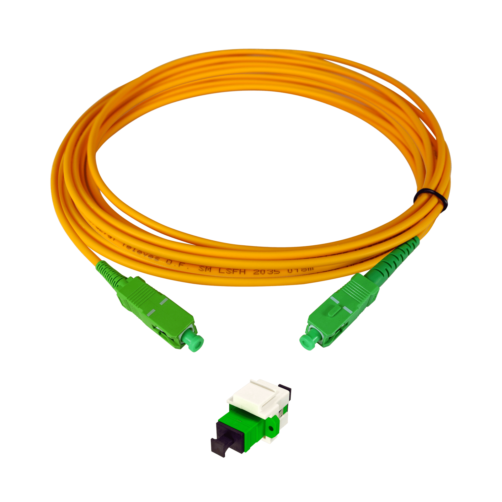 Kit prese F.O. con keystone, adattatore e bretelle preconnettorizzate SC/APC. Kit completo per l'installazione di una presa in fibra ottica connettorizzata. Il modulo keystone consente l'installazione di un adattatore in fibra ottica femmina ''SC/APC'' in una cover per presa di tipo RJ45. Il modulo, insieme all'adattatore, costituisce un'uscita terminale in fibra ottica. Include anche una bretella in fibra ottica monomodale preconnettorizzata con connettori ''SC/APC'', per fornire il segnale dall'UAP ottico alla presa. Questa bretella è appositamente progettata con un connettore più corto a una delle estremità, evitando così aumenti di attenuazioni nel segnale a causa di curve eccessive. il connettore corto facilita lo scorrimento della brettella attraverso i condotti, riduce lo spazio necessario per il collegamento e il raggio di curvatura è meno impegnativo. Lunghezza: 10 m.. Modulo Keystone di dimensioni standard, che lo rendono compatibile con molte cover RJ45. Semplice Installazione: il modulo Keystone viene inserito nel coperchio premendo fino a quando le linguette del modulo si agganciano. L'adattatore viene installato sul modulo Keystone con la stessa procedura. Design della bretella riadattato per un''installazione alla presa: il suo connettore più corto ne facilita il passaggio nel tubo fino alla presa. F.O. adattatore con otturatore interno: blocca automaticamente il passaggio della luce quando il connettore viene rimosso, garantendo la protezione degli occhi. Perdite di inserzione molto basse. Bretella con Euroclasse Dca-s2,d2,a1. Connettore corto ad un'estremità: consente un raggio di curvatura più piccolo e un migliore utilizzo dello spazio nell'area di connessione. Connettori ''SC/APC''. Modulo Keystone costruito in plastica PVC di colore bianco. Bretella di fibra monomodale ITU-T G657A2 e guaina esterna in LSFH di colore arancione. Bretella disponibile in diverse lunghezze.