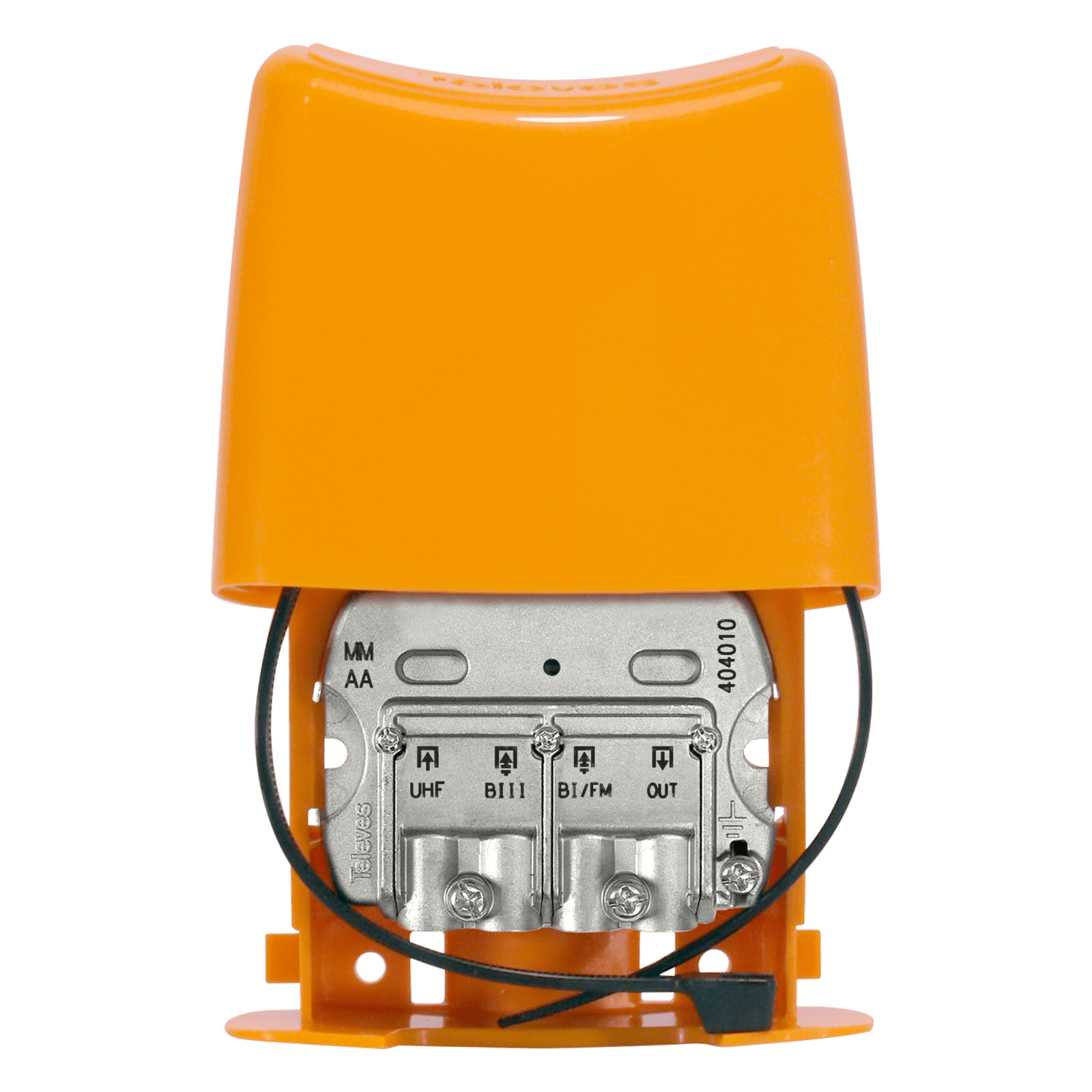 Miscelatore di segnali terrestri 3 ingressi: BI/FM-BIII/DAB-UHF. Miscelatore da 3 ingressi per diverse bande terrestri. Include la scatola per la sua installazione in esterno, direttamente a palo. Consente il passaggio della corrente dall'uscita all'ingresso UHF, per alimentare un amplificatore da palo o un sistema BOSS. Colore: Arancione.. Sistema EasyF: Connettorizzazione facile,rapida e molto sicura. Telaio ad alta schermatura, costruito in Zamak. Passaggio di corrente (DC). Scatola in resistente plastica ABS per la sua installazione da esterno.