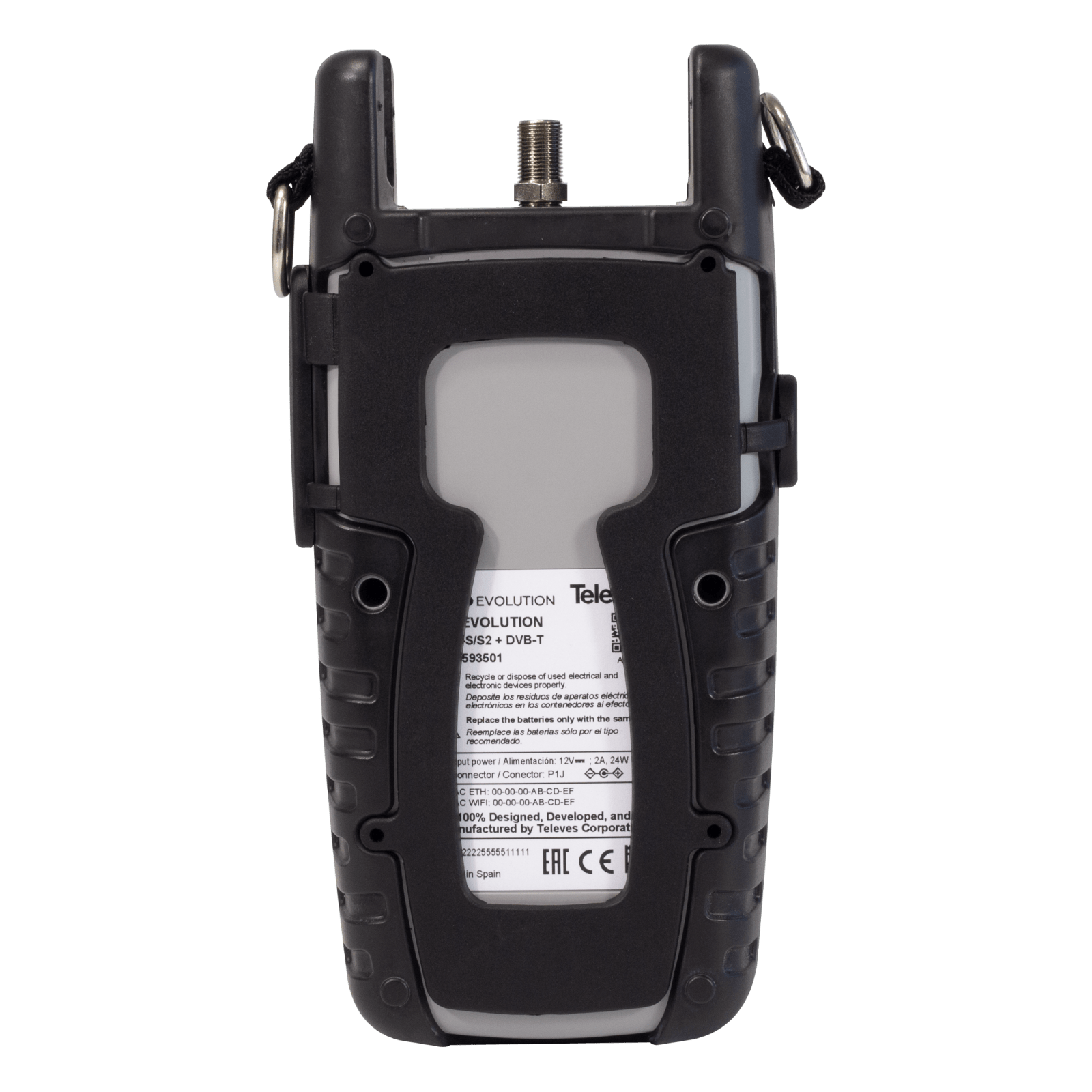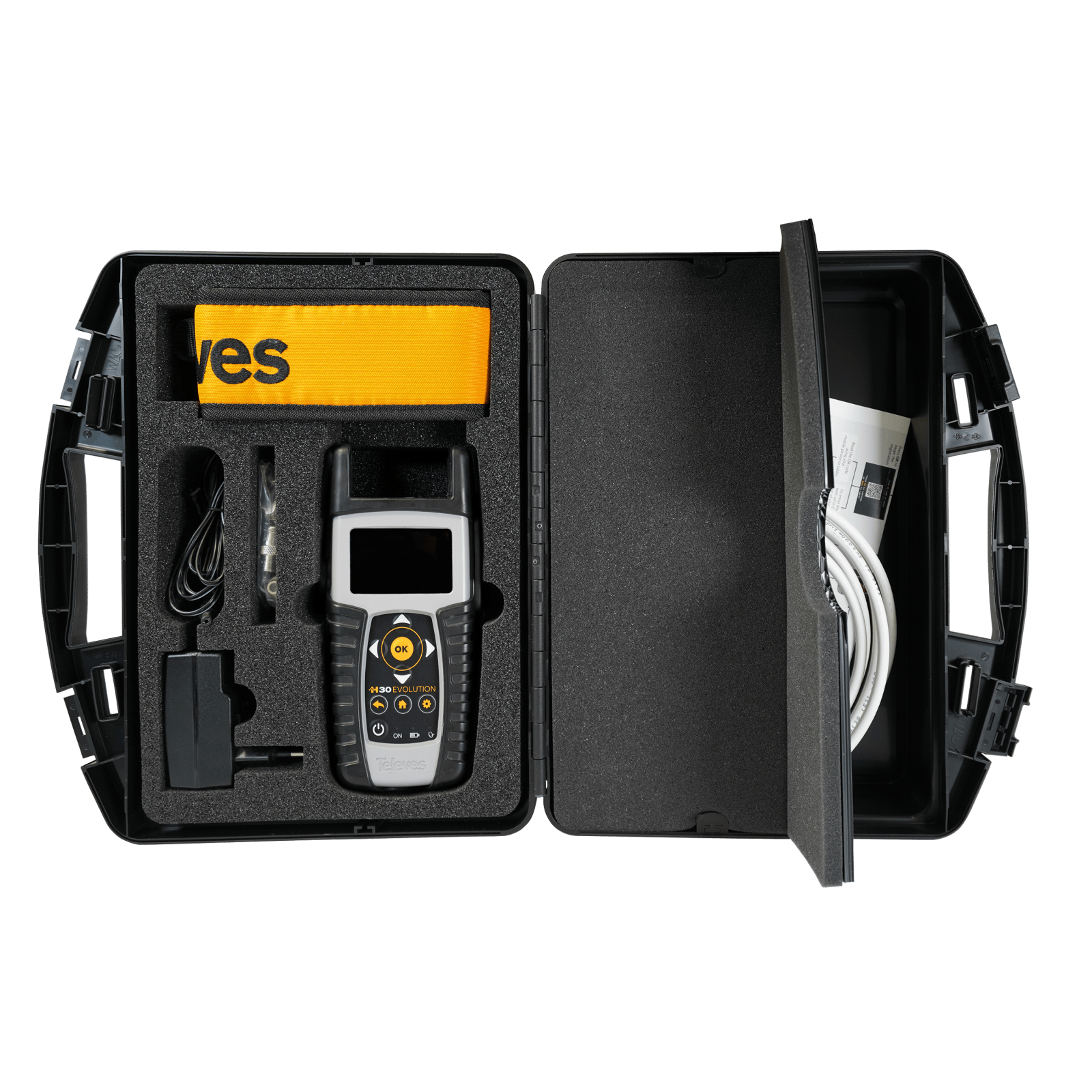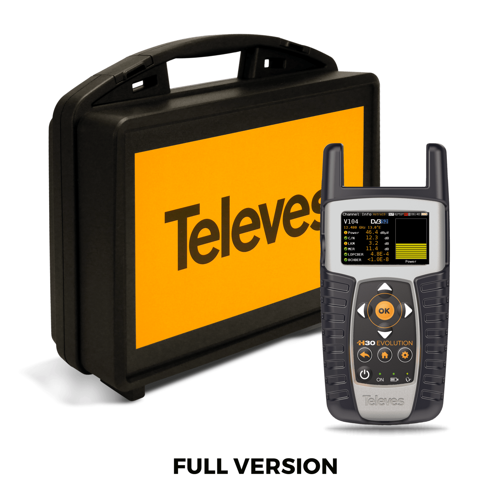 Misuratore di campo H30Evolution. L'H30Evolution è un misuratore di campo che unisce il meglio di uno strumento portatile e compatto, distintivo della serie H30, con funzionalità rivoluzionarie. Grazie al suo innovativo sistema multischermo basato sulla connettività wireless, l'utente può utilizzare un qualunque dispositivo mobile (Android, iOS o PC) per visualizzare e controllare a distanza il misuratore, sfruttando la flessibilità e comodità di gestione propria di un sistema senza cavi. Inoltre, affinché l'utilizzo dello smartphone sia il più naturale possibile, si include un braciale universale per mobili da 6''. L' H30Evolution è uno strumento compatto, leggero e robusto, con una completa gamma di strumenti e funzioni per realizzare a perfezione lavori di installazione, di manutenzione e di risoluzione di problematiche in distribuzioni con segnali DVB-S/S2, DVB-T/T2, DVB-C e analogici. Essendo uno strumento multistandard, è possibile aggiornare le opzioni con il software scaricabile con licenza, senza dovere cambiare lo strumento. Per garantire buone prestazioni all'esterno, è inclusa una protezione dei connettori che impedisce l'accumulo di polvere e le infiltrazioni d'acqua sui connettori. Così come tutti i misuratori progettati e prodotti dal Gruppo Televés, l'H30Evolution gode di tutti i vantaggi della tecnologia dell'elaborazione digitale, offrendo all'utente una precisione matematica e una velocità in tempo reale, propia degli strumenti da laboratorio. Il art. 593553 incorpora l'opzione di visualizzazione HEVC 265, consentendo di ottenere una risoluzione Full HD (1920 x 1080) direttamente nel misuratore. Standard inclusi: DVB-S/S2 + DVB-T/T2 + DVB-C, Complement: FULL: Misuratore + Analizzatore WiFi e IPTV + Prolunga Coassiale + Valigetta di Trasporto.. Multischermo con controllo tattile: visualizzazione dello schermo del misuratore su di un dispositivo mobile con controllo dello strumento mediante gesti e tasti tattili . Connettività wireless. Supporta LNB WideBand. Puntamento satellite guidato. Elaborazione digitale in tempo reale. Strumento tascabile e leggero. Interfaccia utente intuitiva. Multistandard, con opzione di analizzatore WiFi, IPTV e visualizzazione HEVC (nel art. 593553, visualizzato sullo schermo). Tutte le misure si realizzano premendo un solo tasto e con gli indicatori Superato/Fallito si riducono gli errori nell’installazione.