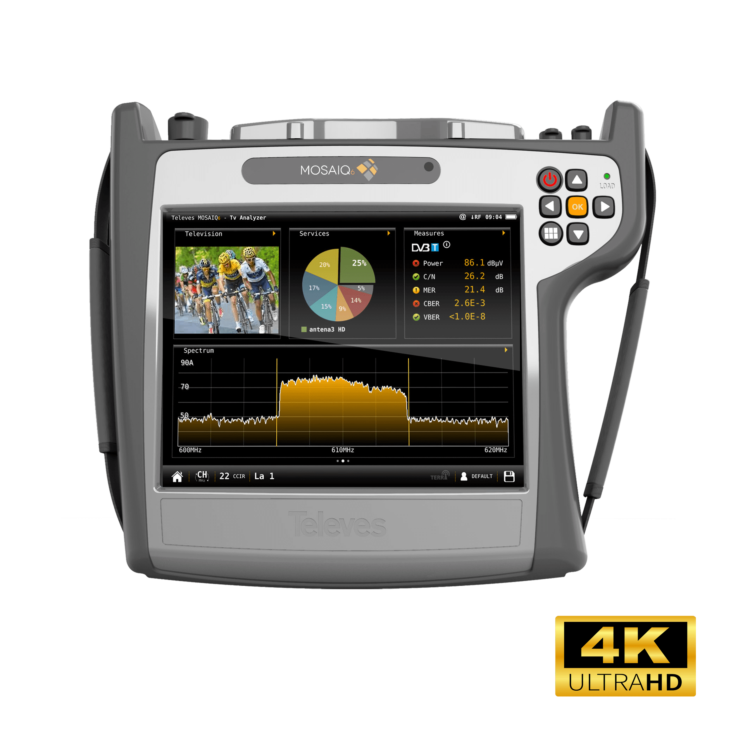 Misuratori di campo MOSAIQ6. Il MOSAIQ6 è un misuratore di campo portatile ad alto rendimento e precisione per professionisti. La sua interfaccia touch screen capacitivo permette di sfruttare il MOSAIQ6 come uno smartphone o tablet. La funzione mosaiq è basata su una interfaccia configurabile, che permette di scegliere i widget a piacere, permettendo di visualizzare fino a 6 finestre contemporaneamente su uno schermo da 8’’. Controllo della installazione su un unico schermo. La sua interfaccia touch screen capacitivo permette di sfruttarlo come uno smartphone o tablet, quindi in grado di rilevare tocchi multipli con un’ottima visibilità e trasparenza. Di facile utilizzo ad altissime prestazioni. Lo strumento viene fornito in una borsa per il trasporto o in una valigetta per il trasporto (a seconda del codice) ed è incluso un kit completo di accessori per facilitarne l'utilizzo da parte dell'installatore: Proteggi schermo. Cinturino regolabile. Set connettori e adattatori coassiali. Set di adattatori per fibra ottica. Cavo coassiale. 3 cavi patch-cords in fibra e 1 cavo adattatore in fibra. Set per la pulizia delle fibre ottiche, con bastoncini e salvietta imbevuta di alcool. 3 flange in velcro. Cavo patch RJ45. Caricabatterie classico e accendisigari auto. Standard inclusi: DVB-T/T2/S/S2/SX/C + CI + F.O., Complement: Misuratore + Borsa di Trasporto.. Un vero schermo touch screen: grado di rilevare tocchi multipli con un’ottima visibilità e trasparenza. Di facile utilizzo ad altissime prestazioni. La funzione mosaiq è basata su una interfaccia configurabile, che permette scegliere i widget a piacere, permettendo visualizzare fino a 6 finestre contemporaneamente su uno schermo da 8’’. Analizzatore di Spetto Ultra-Veloce: Processatore digitale in tempo reale. Sempre carico: Batteria di ricambio di facile sostituzione. Ergonomia: Design ottimizzato per massimizzare l’efficienza dei movimenti. Gestione efficente: Misuratore sempre affiornato dal Cloud.