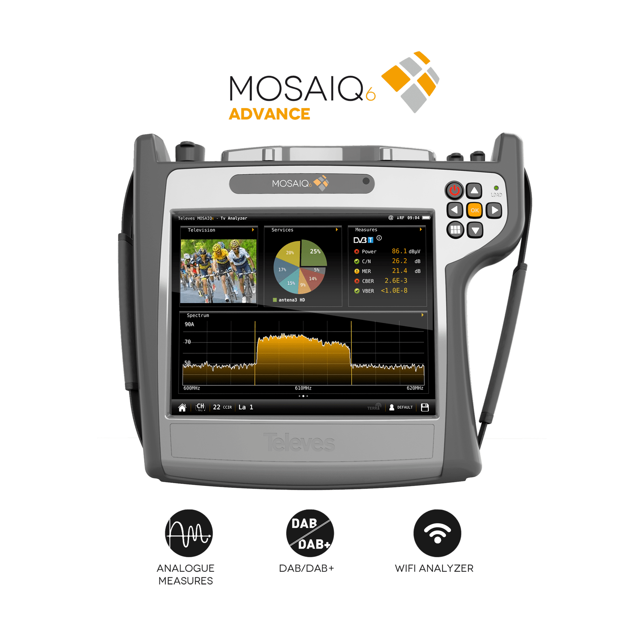 Misuratori di campo MOSAIQ6. Il MOSAIQ6 è un misuratore di campo portatile ad alto rendimento e precisione per professionisti. La sua interfaccia touch screen capacitivo permette di sfruttare il MOSAIQ6 come uno smartphone o tablet. La funzione mosaiq è basata su una interfaccia configurabile, che permette di scegliere i widget a piacere, permettendo di visualizzare fino a 6 finestre contemporaneamente su uno schermo da 8’’. Controllo della installazione su un unico schermo. La sua interfaccia touch screen capacitivo permette di sfruttarlo come uno smartphone o tablet, quindi in grado di rilevare tocchi multipli con un’ottima visibilità e trasparenza. Di facile utilizzo ad altissime prestazioni. Lo strumento viene fornito in una borsa per il trasporto o in una valigetta per il trasporto (a seconda del codice) ed è incluso un kit completo di accessori per facilitarne l'utilizzo da parte dell'installatore: Proteggi schermo. Cinturino regolabile. Set connettori e adattatori coassiali. Set di adattatori per fibra ottica. Cavo coassiale. 3 cavi patch-cords in fibra e 1 cavo adattatore in fibra. Set per la pulizia delle fibre ottiche, con bastoncini e salvietta imbevuta di alcool. 3 flange in velcro. Cavo patch RJ45. Caricabatterie classico e accendisigari auto. Standard inclusi: DVB-T/T2/S/S2/SX/C + CI + F.O., Complement: Advance: Misuratore + Analizzatore WiFi + Advance: Mesure Analogiche + DAB/DAB+ + Borsa di Trasporto.. Un vero schermo touch screen: grado di rilevare tocchi multipli con un’ottima visibilità e trasparenza. Di facile utilizzo ad altissime prestazioni. La funzione mosaiq è basata su una interfaccia configurabile, che permette scegliere i widget a piacere, permettendo visualizzare fino a 6 finestre contemporaneamente su uno schermo da 8’’. Analizzatore di Spetto Ultra-Veloce: Processatore digitale in tempo reale. Sempre carico: Batteria di ricambio di facile sostituzione. Ergonomia: Design ottimizzato per massimizzare l’efficienza dei movimenti. Gestione efficente: Misuratore sempre affiornato dal Cloud.