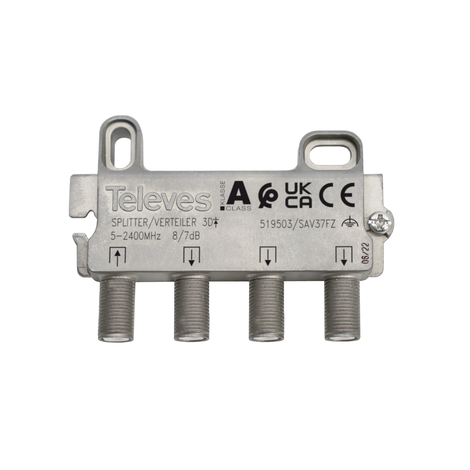 Partitore F 3 Vie 5...2400MHz 8/7dB. Partitore a 3 vie con connettori F, per segnali SMATV. Presenta basse perdite di passaggio grazie al suo design compatto e al suo efficiente comportamento elettronico. Inoltre, il suo telaio offre un'ottima schermatura poiché è realizzato in Zamak.Partitori per installazioni da interno, montaggio a parete, su piastra rack o su guida DIN standard. Imballaggio: Scatola, Metodo di fornitura: Imballo multipo.. Flessibilità di montaggio: può essere installato tramite viti a parete, su piastre rack con dadi sui relativi connettori, o su guida DIN standard (con adattatore art. 519901). Facilità di inserimento del cavo, grazie all'angolo di inclinazione di 10º dei connettori F rispetto alla parete di installazione. Ottimizzazione dello spazio nelle cassette di derivazione e negli armadi: i suoi connettori si trovano sempre sullo stesso lato. Migliore organizzazione dell'impianto: permette il passaggio dei cavi attraverso la sua parte posteriore. Tutti i partitori di questa gamma possono essere fissati tramite vite, richiedendo un unico cavo di messa a terra. Mantiene i livelli alla presa, anche con cavi lunghi, grazie a una migliore planarità nella risposta al passaggio. Elevata affidabilità: produzione in linee robotizzate con microchip all'avanguardia. Basse perdite di passaggio. Ottima schermatura (classe A), fabbricato in Zamak. Connettori F con sezione filettata maggiorata, per facilitare e rendere sicura la loro installazione su piastra rack. Montaggio da interno. Include vite per la messa a terra. Passaggio di DC dalle uscite all'ingresso. Design, qualità e produzione 100% europei.