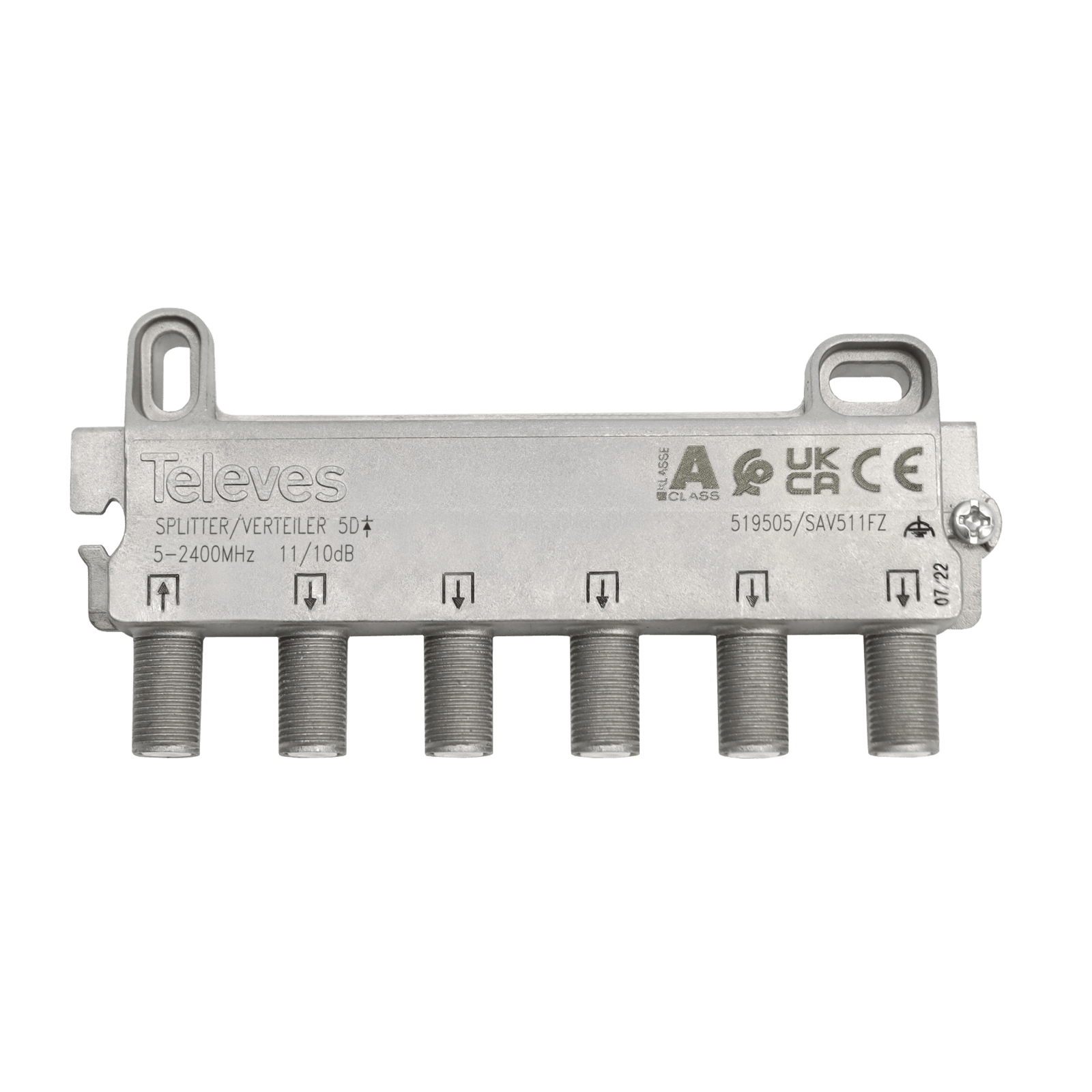 Partitore F 5 Vie 5...2400MHz 11/10dB. Partitore a 5 vie con connettori F, per segnali SMATV. Presenta basse perdite di passaggio grazie al suo design compatto e al suo efficiente comportamento elettronico. Inoltre, il suo telaio offre un'ottima schermatura poiché è realizzato in Zamak.Partitori per installazioni da interno, montaggio a parete, su piastra rack o su guida DIN standard. Imballaggio: Scatola, Metodo di fornitura: Imballo multipo.. Flessibilità di montaggio: può essere installato tramite viti a parete, su piastre rack con dadi sui relativi connettori, o su guida DIN standard (con adattatore art. 519901). Facilità di inserimento del cavo, grazie all'angolo di inclinazione di 10º dei connettori F rispetto alla parete di installazione. Ottimizzazione dello spazio nelle cassette di derivazione e negli armadi: i suoi connettori si trovano sempre sullo stesso lato. Migliore organizzazione dell'impianto: permette il passaggio dei cavi attraverso la sua parte posteriore. Tutti i partitori di questa gamma possono essere fissati tramite vite, richiedendo un unico cavo di messa a terra. Mantiene i livelli alla presa, anche con cavi lunghi, grazie a una migliore planarità nella risposta al passaggio. Elevata affidabilità: produzione in linee robotizzate con microchip all'avanguardia. Basse perdite di passaggio. Ottima schermatura (classe A), fabbricato in Zamak. Connettori F con sezione filettata maggiorata, per facilitare e rendere sicura la loro installazione su piastra rack. Montaggio da interno. Include vite per la messa a terra. Passaggio di DC dalle uscite all'ingresso. Design, qualità e produzione 100% europei.