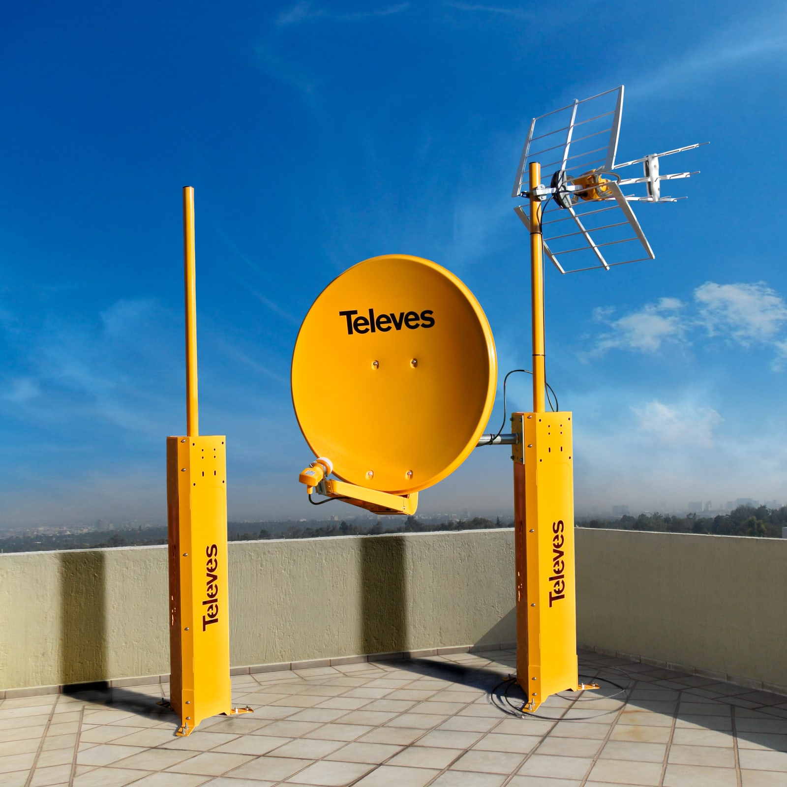 Traliccio Pack . Struttura a supporto di antenne progettata per un'installazione semplice senza la necessità di manutenzione. Grazie alle sue tre lastre ed al palo incluso, ottimizza il trasporto, lo spostamento e lo stoccaggio. Chesta traliccio è una soluzione molto interessante per abitazioni singole o anche come traliccio espositiva per ambienti professionali.. . Avvitabile direttamente al suolo: l'installazione si realizza senza la necessità di lavori di muratura. Lunga durata: Costruita in acciaio galvanizzato e laccata al forno con polvere elettrostatica di poliestere che garantisce oltre 15 anni contro la corrosione .Inoltre le viti sono in acciao inossidabile. Design accattivante: soluzione estetica per il raggruppamento di tutte le antenne. Imballo compatto che evita problemi di spazio di stoccaggio e trasporto. Versatile: Con spazio per montare più antenne, può essere installato sul montante che incorpora o utilizzando la staffe a ''L'' (art. 7349). Installazione ottimizzata: la posa dei cavi è integrata all'interno della traliccio, chesto consente una maggiore durata nel tempo rendendo l'installazione TV di qualità. Plug and play: kit completo di tutti gli accessori necessari per il montaggio.