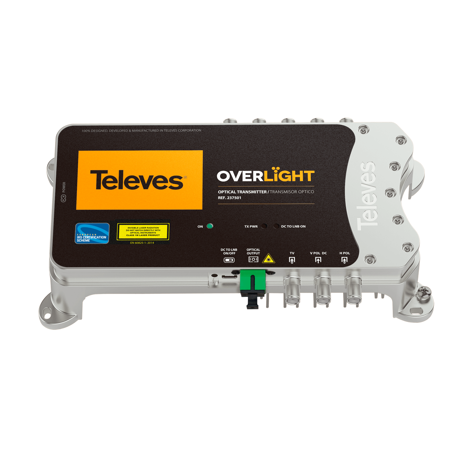 Trasmettitore ottico Overlight CWDM DAB/UHF/SAT, 1550nm, Po 9dBm. CWDM Trasmettitore ottico terrestre e satellitare wideband. Questo dispositivo riceve un segnale RF satellitare da un LNB wideband e dalla banda terrestre distribuendolo fino a 64 utenti su un'uscita in fibra nella finestra di 1550 nm con potenza ottica di 9 dBm.Grazie alla sua elettronica ottimizzata e alle basse perdite, consente di ridurre il numero di amplificatori necessari e semplifica l'impiego nella progettazione di installazioni condominiali, preservando la qualità del segnale durante tutto il processo. Inoltre, è pienamente indicato per l'utilizzo in impianti GPON e si adatta a diverse soluzioni.Questo dispositivo fa parte del sistema Overlight, che distribuisce segnali satellitari e terrestri a più utenti attraverso un'unica fibra ottica.Permette l'amplificazione. . Alto livello di uscita che lo rende ideale per installazioni condominiali fino a 64 utenti . Adattabile a diverse soluzioni, soprattutto quelle con tecnologia dCSS. Basse perdite. Elettronica ottimizzata. Design, qualità e produzione europei al 100%.