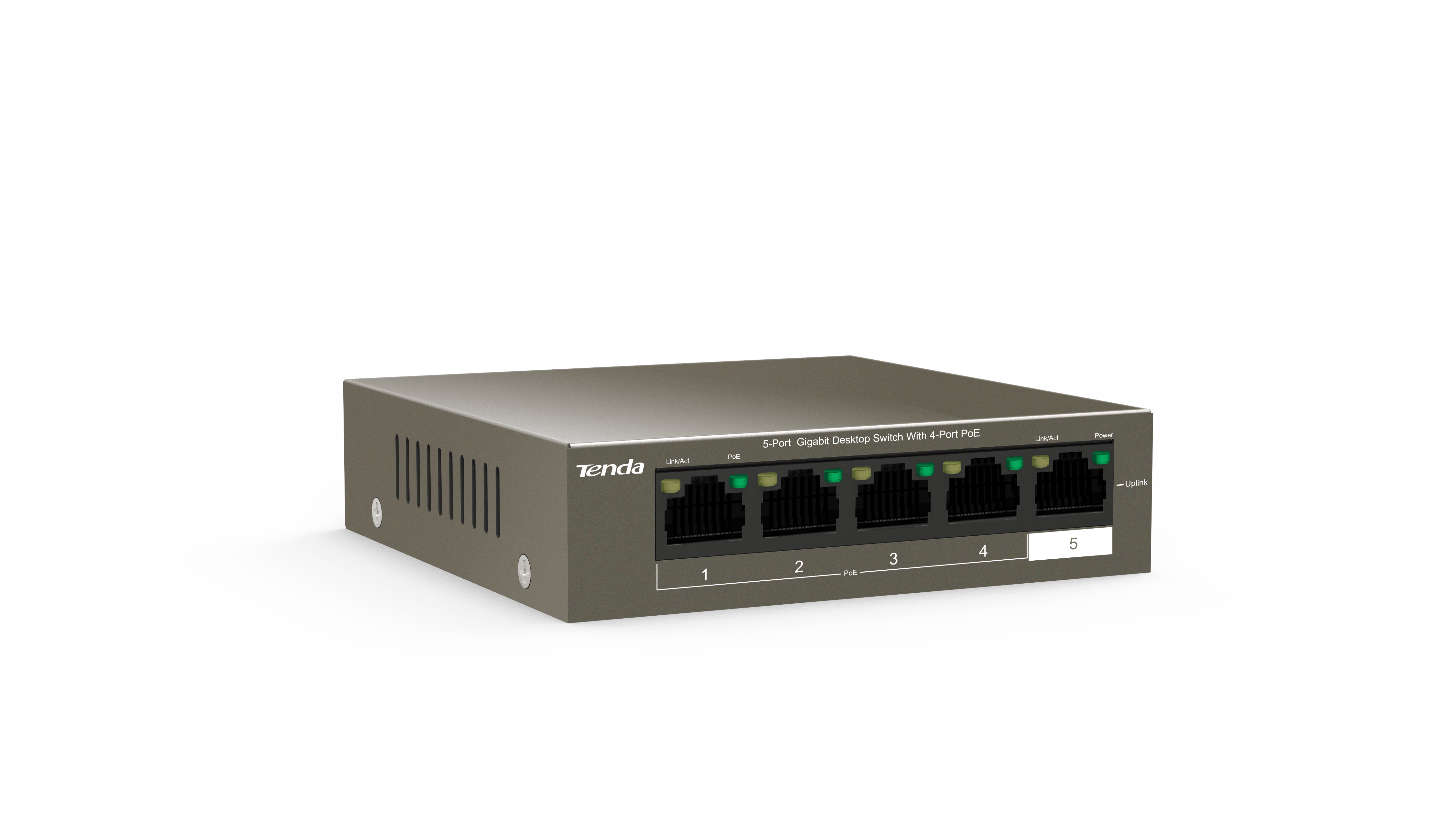 TENDA - Switch non gestito 5 porte Gigabit, 4 porte PoE 802.3af/at (max 58W), 1 porta uplink, 6 kV protezione fulmini, metal case, plug and play. 429434500